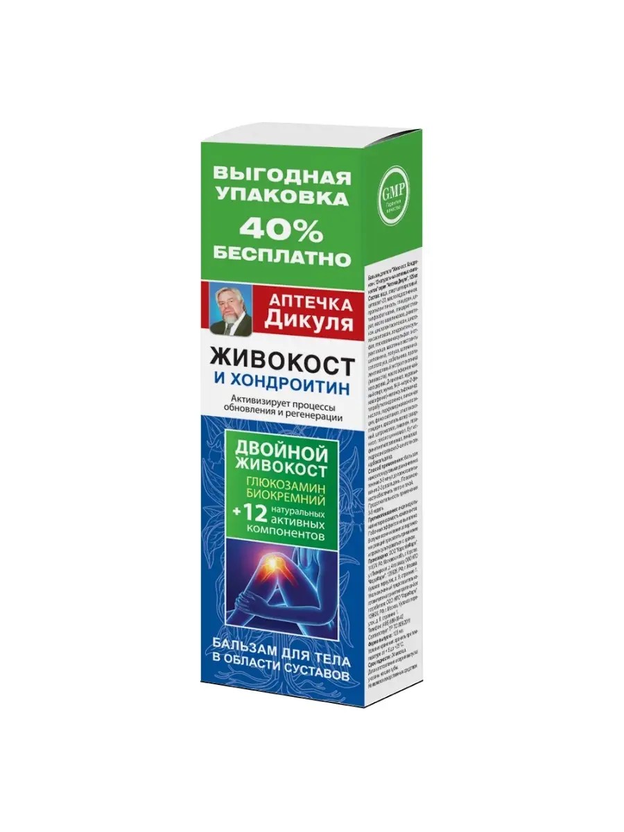 Dikul's First Aid Kit Comfrey Body Balm with Chondroitin is a natural multi-component body treatment for joint and spine issues. The balm's action is aimed at activating blood circulation and normalizing tissue function, maintaining healthy function, and inhibiting destructive processes. Comfrey is a unique plant, unrivaled in the treatment of joint diseases and injuries. It contains a record amount of allantoin and organic acids, which reduce inflammation and stimulate cartilage renewal and regeneration. Chondroitin and glucosamine are the main components of cartilage tissue and natural protectors of cartilage cells. Combined use of chondroitin and glucosamine provides a higher saturation of the body with chondroprotectors compared to the action of a single component, as well as a more pronounced effect. Horsetail holds the record for silicon content among plants. Silicon is involved in the synthesis of collagen, a vital component of bones, cartilage, and ligaments. With age, silicon levels in the body decrease significantly, and its deficiency manifests itself through decreased joint mobility and other problems. Shilajit stimulates joint regeneration and connective tissue cell proliferation, and has anti-edematous and anti-inflammatory effects. A synergistic blend of medicinal plant extracts has an anti-inflammatory effect, promotes the elimination of salts, reduces swelling and muscle spasms, stimulates blood circulation, and improves tissue trophism. This product is not a medicinal product. Contraindications: Individual intolerance to any of the ingredients. If allergic reactions occur, discontinue use and consult a physician.