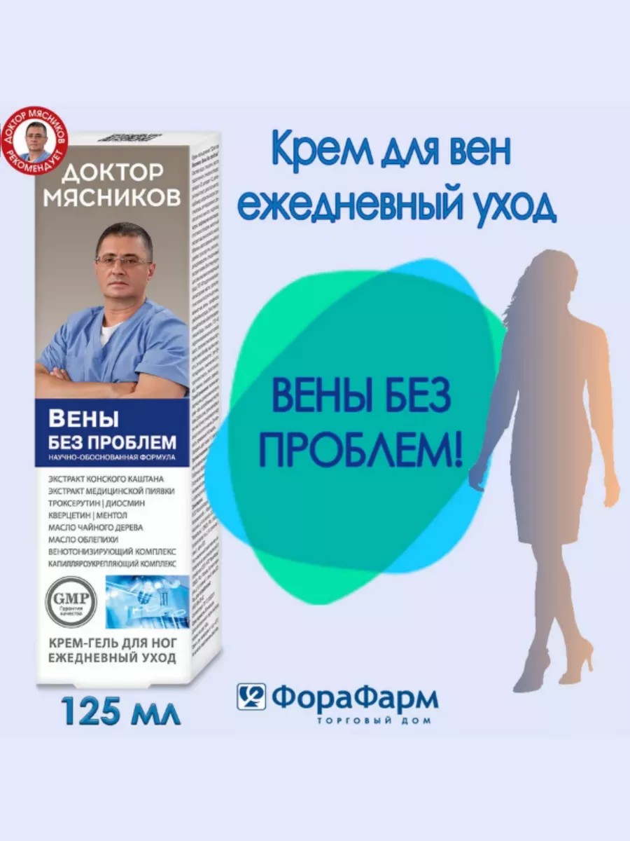 Александр Леонидович Мясников Российский врач в четвертом поколении. Компетентность его советов не вызывает сомнений, так как за его плечами огромный опыт работы в РФ и за границей, а также обширная медицинская практика. Совместно с ним разработана серия кремов для ног: Гирудотерапия, Вены без проблем, Тяжесть отеки ног, Судороги ног. Это специальные средства для профилактики венозной недостаточности, а также ее косметических проявлений, в виде сосудистых звездочек и сеточек. Оказывают венотонизирующие и противоотечные действия, уменьшают венозный застой, укрепляют стенки капилляров, улучшают микроциркуляцию и лимфоотток. В состав кремов для вен входит экстракт медицинской пиявки – уникальное природное средство для лечения варикозной болезни ног. Ее слюнные железы содержат около 100 биологически активных веществ, которые оказывают интенсивное лечебное воздействие на кровеносные сосуды, улучшают состав крови, обладают обезболивающим и заживляющим действием. Троксерутин способствует снятию тяжести и усталости в ногах, устранению сосудистой сеточки, застоя венозной крови, предотвращает вздутие вен. Крем-гель с троксерутином создает приятное ощущение прохлады, расслабляет, снимает усталость и тяжесть в ногах. Диосмин – природный гликозид, способствующий активизации кровообращения, уменьшению растяжимости вен, снижению отечности. Ментол охлаждает кожные покровы и слизистые оболочки, обладает местным анестезирующим действием. Экстракт конского каштана в мазе для ног укрепляет стенки капилляров и вен, способствует рассасыванию тромбов и предупреждает их образование. Так же в кремах присутствуют венотонизирующий и капилляроукрепляющий комплексы.