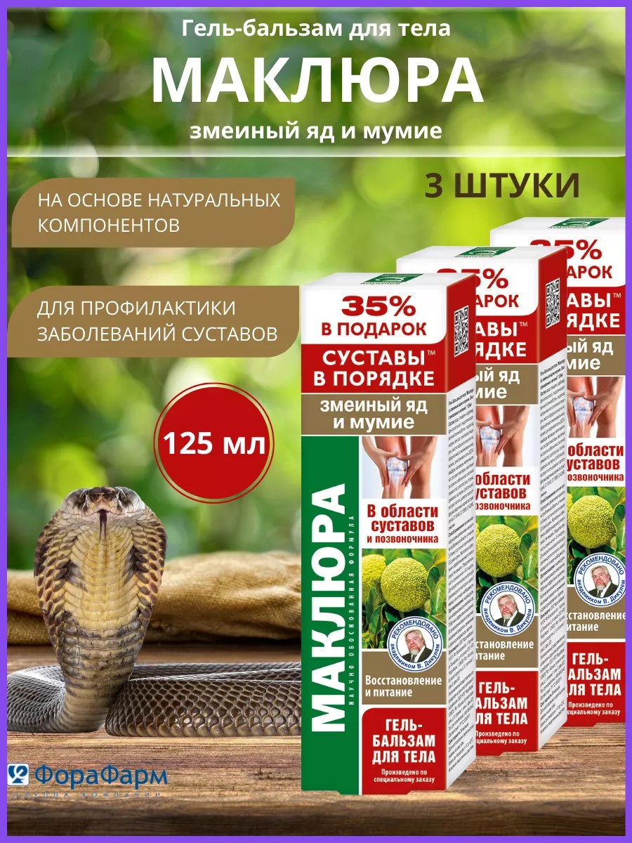 The Maclura series of creams, gels, and balms for the body, targeting joints and the spine, with mud from Saki Lake, bee venom, mumiyo, and blunt-nosed viper venom, is an effective remedy based on natural ingredients. It helps normalize joint function, stimulates natural tissue regeneration, and prevents the development of destructive processes. Due to its composition, Maclura has a comprehensive effect on joints. Bile acids normalize lipid levels, fatty acids prevent disease, and citric acid removes uric acid and cleanses joints. The unique sulfide mud of Saki Lake is unparalleled in the world, and its healing effects are truly astounding. According to some reports, Saki mud is superior in effectiveness to the salts and mud of the Dead Sea. Saki Lake mud is a dark-colored, oily, and viscous substance with a distinctive hydrogen sulfide odor. This healing remedy contains mineral salts, live microorganisms, organic acids, and other active ingredients that have an anti-inflammatory effect, strengthen the immune system, and normalize metabolism. Shilajit helps with radiculitis, polyarthritis, osteochondrosis, and other joint-related conditions. The venom of the blunt-nosed viper is unique and surpasses that of almost all vipers. Ointments made with blunt-nosed viper venom are used for joint diseases to relieve pain and inflammation. Camphor has an antiseptic and hyperemic effect, improving blood microcirculation. Capsaicin, the active ingredient in red chili peppers, helps reduce arthritis pain. This miracle ointment is suitable in combination with other treatments, as a pain reliever, for the care and nourishment of joints in the legs and arms, and for warming and cooling, as well as for massage. Maclura body cream with a scientifically proven formula is recommended for osteochondrosis, rheumatism, radiculitis, gout, arthritis, bursitis, and arthrosis of the knee joint.