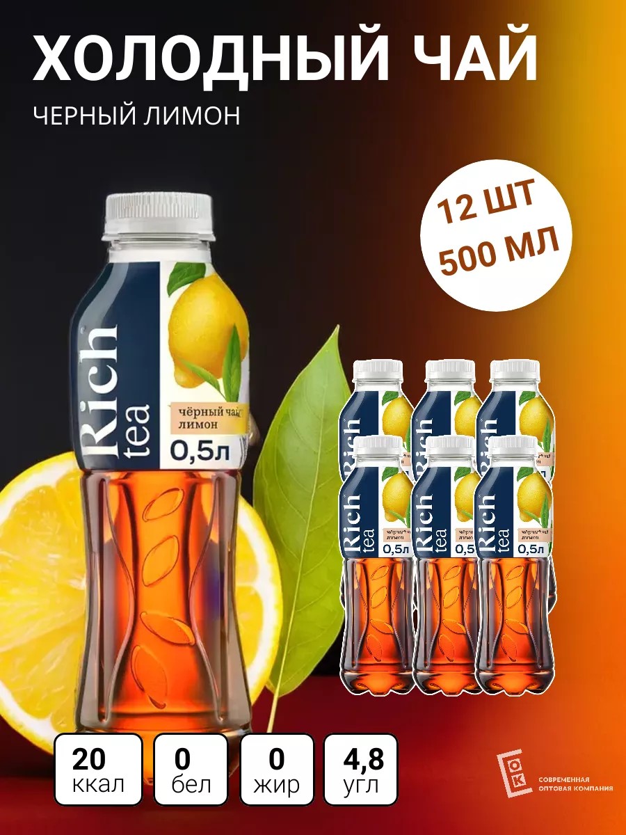 Упаковка содержит 12 бутылок по 500 мл каждая, что делает этот чай удобным для употребления дома, в офисе или в дороге. Холодный черный чай Рич с лимоном обязательно понравится ценителям насыщенного вкуса и тем, кто предпочитает чайные напитки с освежающими нотками цитруса.