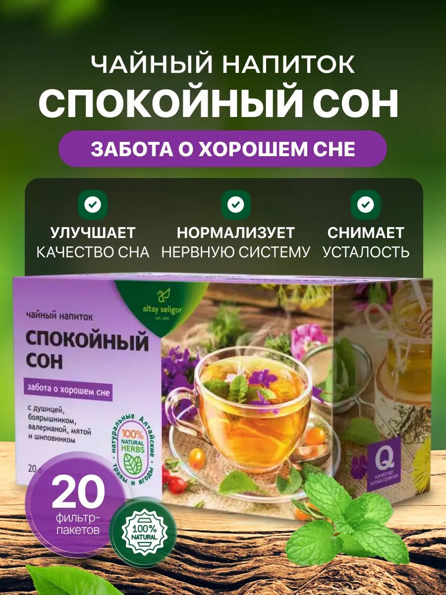 Чайный напиток Спокойный сон — это ваш надежный спутник для достижения глубокого и восстанавливающего сна. Позаботьтесь о своем здоровье и комфорте с помощью нашего лечебного фиточая!
