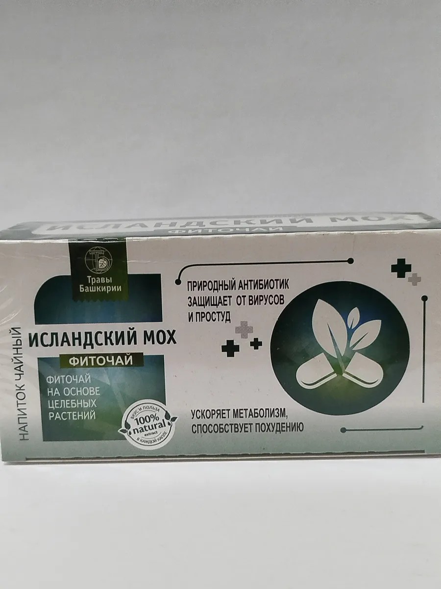 Исландский мох фиточай марки Травы Башкирии - травяной чай от кашля для детей и взрослых, который улучшает состояния верхних дыхательных путей и укрепляет иммунитет. Этот природный антибиотик, оказывает антибактериальное, противовирусное, иммуномодулирующее и отхаркивающее действия, повышает защитные функции организма и нормализует работу ЖКТ. Исландский мох нашёл применение в народной медицине, гомеопатии, его экстракт входит в состав лекарственных средств, например, сиропа от кашля и простуды. Цетрария оказывает обволакивающее действие, смягчает раздражение и способствует регенерации поврежденного эпителия, оказывает благоприятное воздействие при першении в горле, сухом кашле, осиплости и охриплости. Сбор эффективен при простудных и вирусных заболеваниях, сопровождающихся сильным кашлем, отхождением мокроты, насморком и повышением температуры тела. В сезон простуд ОРЗ и ОРВ исландский мох рекомендуется с целью профилактики вирусных заболеваний, для укрепления иммунитета. Благодаря ранозаживляющим и обволакивающим свойствам растение применяют для лечения гастрита и язвы желудка, при воспалении десен и нарушениях слизистых оболочек, при кожных заболеваниях для лечения псориаза, дерматита, аллергических реакций или ожогов. Напиток способствует улучшению обмена веществ, ускорению метаболизма, поэтому применяется в диетологии при похудении.
