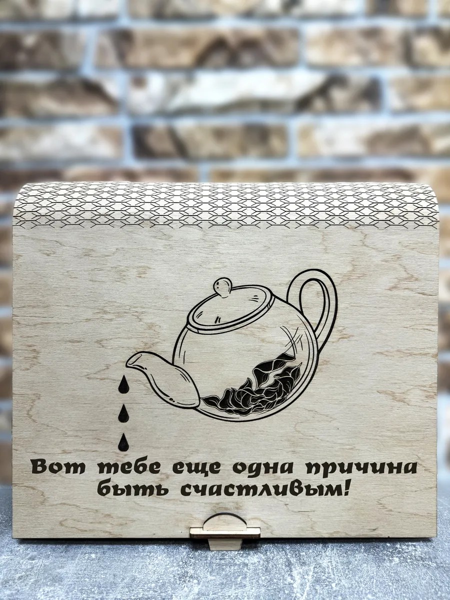 Коробка с гравировкой "Вот тебе еще одна причина быть счастливым!". Нужно, что-то особенное для вашей подруги? Без проблем. Для мамы? У нас всё есть! В нашем магазине вы найдёте подарок на любой праздник и повод. Погрузитесь в мир бесконечных чайных приключений с нашим уникальным набором чая-конструктора. Это не просто очередной чайный набор — это возможность создать свой идеальный напиток из натуральных ягод, трав, фруктов, специй и высококачественного чая. Сочетайте три вида чая с восемью видами ингредиентов, следуя нашим рецептам или придумывая свои собственные. И все это — в стильной именной деревянной коробке, которая станет прекрасным подарком для любого ценителя чая. Испытайте истинное наслаждение и откройте для себя новые вкусы с нашим чаем-конструктором!