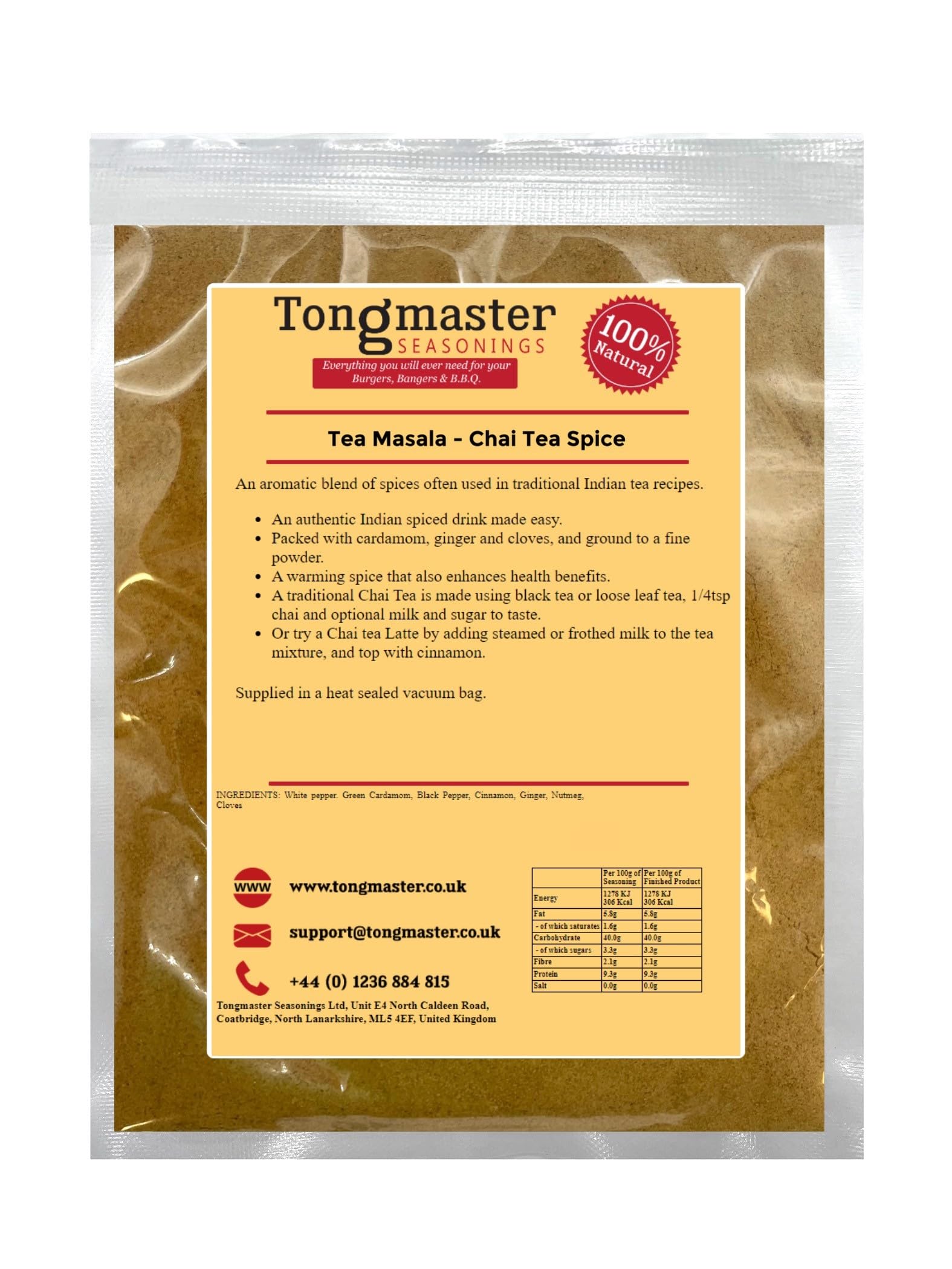Tongmaster supplies only the finest and top quality ingredients. We're experts in the trade having over 40 years experience supplying to butchers, supermarkets and households alike. Our seasoning's and recipe's perfected over time will be a big hit with your family or customers. All Tongmaster products come complete with easy to follow instructions. INGREDIENTS White pepper. Green Cardamom, Black Pepper, Cinnamon, Ginger, Nutmeg, Cloves DIRECTIONS A traditional Chai Tea is made using black tea or loose leaf tea, 1/4tsp chai and optional milk and sugar to taste. See more