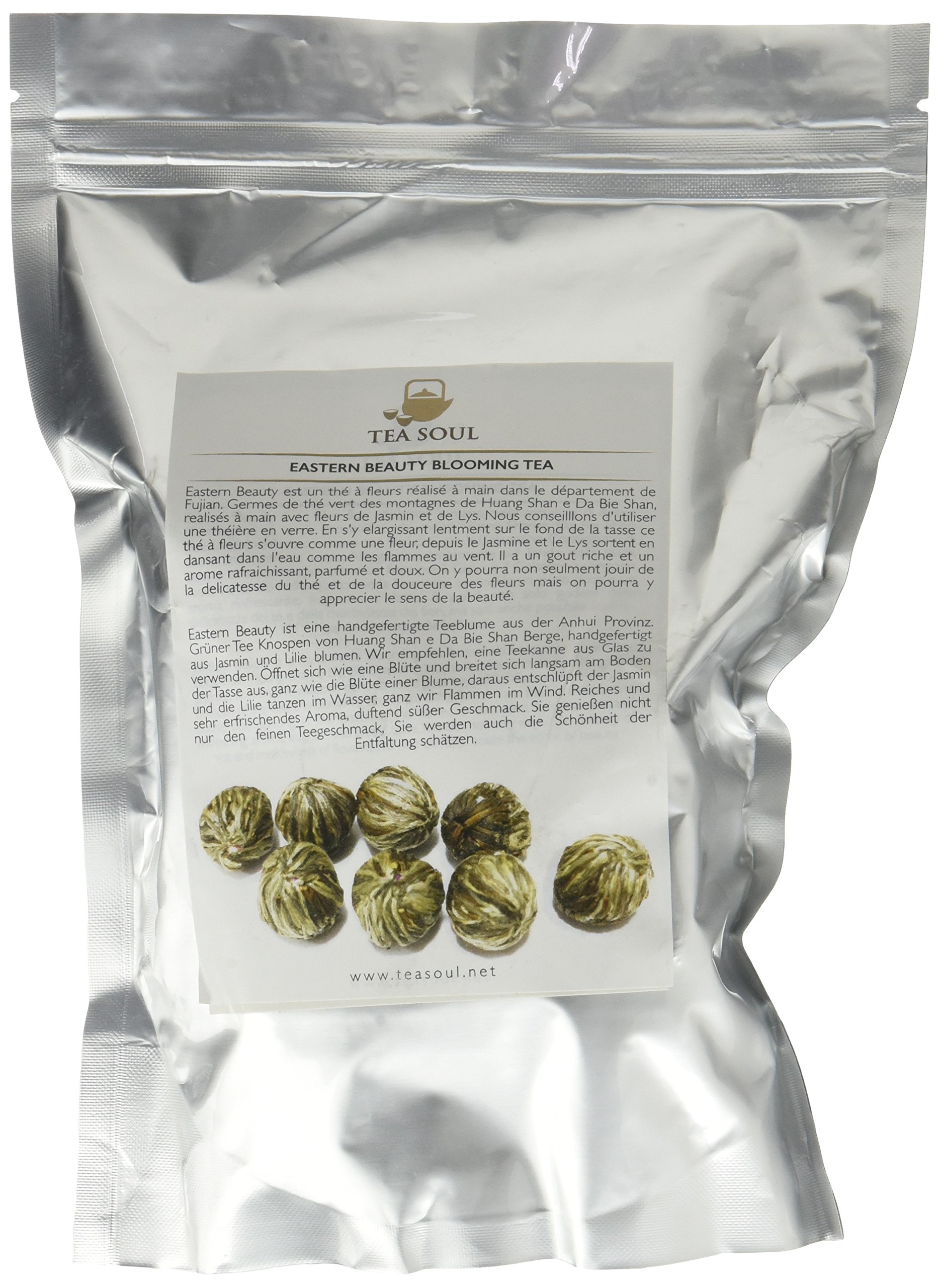 : Ester Beauty is a handcrafted flower tea from Anhui Prefecture. It is made with green tea buds from the Huangshan and Da Bieshan mountains, hand-tied with jasmine and lily blossoms. We recommend using a glass teapot. As it slowly expands at the bottom of the cup, this flower tea unfurls like a blossom, with the jasmine and lily emerging and dancing in the water like flames in the breeze. It has a rich taste and a refreshing, fragrant, and delicate aroma. You can not only enjoy the tea's delicate flavor and the sweetness of the flowers, but also appreciate the essence of beauty. Ingredients: Tea, Lily Flowers 5 , Jasmine Flowers 8 P.when('A').execute(function(A) { A.on('a:expander:toggle_description:toggle:collapse', function(data) { window.scroll(0, data.expander. expander[0].offsetTop-100) }) }) Instructions: Place a piece of flowering tea in a glass teapot or infuser or cup, and pour hot water over the tea. Wait at least 3 to 5 minutes to allow the tea to fully open and reveal the beautiful flower inside. When the flower is fully open, you can pour the tea into teacups or drink directly from the cup. See moreOrigin: Anhui, China. Category: Flower tea, Box: 250g. It has a rich taste and a refreshing, fragrant, and sweet aroma. You can not only enjoy the delicacy of the tea and the sweetness of the flowers, but also appreciate its beauty. We recommend using a glass teapot. As it slowly expands at the bottom of the cup, this flower tea unfurls like a blossom, with jasmine and lily emerging and dancing in the water like flames in the wind. Ester Beauty is a flower tea handcrafted in Anhui Prefecture. Green tea buds from the Huangshan and Da Bieshan mountains, handcrafted with jasmine and lily flowers.Description du produit Ester Beauty est un thé à fleurs réalisé à main dans le département de Anhui. Germes de thé vert des montagnes de Huang Shan e Da Bie Shan, réalisés à main avec fleurs de Jasmin et de Lys. Nous conseillons d'utiliser une théière en verre. En s'y élargissant lentement sur le fond de la tasse ce thé à fleurs s'ouvre comme une fleur, depuis le Jasmine et le Lys sortent en dansant dans l'eau comme les flammes au vent. Il a un gout riche et un arome rafraichissant, parfumé et doux. On y pourra non seulement jouir de la délicatesse du thé et de la douceur des fleurs mais on pourra y apprécier le sens de la beauté. Ingrédients Thé, fleurs de Lys 5 , fleurs de Jasmin 8 P.when('A').execute(function(A) { A.on('a:expander:toggle_description:toggle:collapse', function(data) { window.scroll(0, data.expander. expander[0].offsetTop-100) }) }) Mode d'emploi Mettez un morceau de thé en fleurs dans une théière en verre ou infuser ou une tasse, versez de l'eau chaude sur le thé. Attendez au moins 3 à 5 minutes pour laisser le thé complètement ouvert et révéler la belle fleur à l'intérieur. Lorsque le fleur est complètement ouvert, vous pouvez verser le thé dans les tasses à thé ou de boire directement à partir de la tasse. Voir plusOrigine: Anhui, Chine. Catégorie: thé à fleurs, Boite: 250 g. Il a un gout riche et un arome rafraichissant, parfumé et doux. On y pourra non seulement jouir de la délicatesse du thé et de la douceur des fleurs mais on pourra y apprécier le sens de la beauté. Nous conseillons d'utiliser une théière en verre. En s'y élargissant lentement sur le fond de la tasse ce thé à fleurs s'ouvre comme une fleur, depuis le Jasmine et le Lys sortent en dansant dans l'eau comme les flammes au vent. Ester Beauty est un thé à fleurs réalisé à main dans le département de Anhui. Germes de thé vert des montagnes de Huang Shan e Da Bie Shan, réalisés à main avec fleurs de Jasmin et de Lys.TEA SOUL Eastern Beauty Thé à Fleur en Feuilles avec Thé Vert Fleurs de Jasmin Lys 250 g