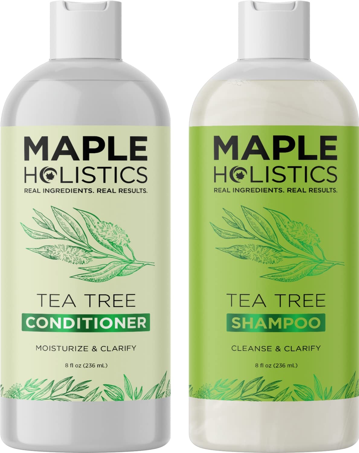 Maple holistics Quality - Redefine your hair care regimen with our tea tree oil shampoo and conditioner set sulfate and paraben free formula for guilt free hair care featuring natural ingredients. Clarifying Shampoo for Build Up - Reimagine and refresh your oily scalp care with our hair clarifying treatment shampoo made with cleansing nutrients that make our oily hair shampoo so reliable. Tea Tree Oil for Scalp - Great hair starts at the scalp and our clarifying shampoo and conditioner for dry hair is a potent scalp moisturizer that tackles tough build up for flawless-looking hair. Dandruff Tip - One of the best ways to avoid flaking and itchy scalp is to discard that artificial dandruff shampoo and conditioner with damaging sulfates and choose a gentler more hydrating formula. Tea Tree Oil for Hair - Try our tea tree conditioner for damaged dry hair and clarifying shampoo for build up combo to help transform lackluster hair thanks to our tea tree scalp care formula.