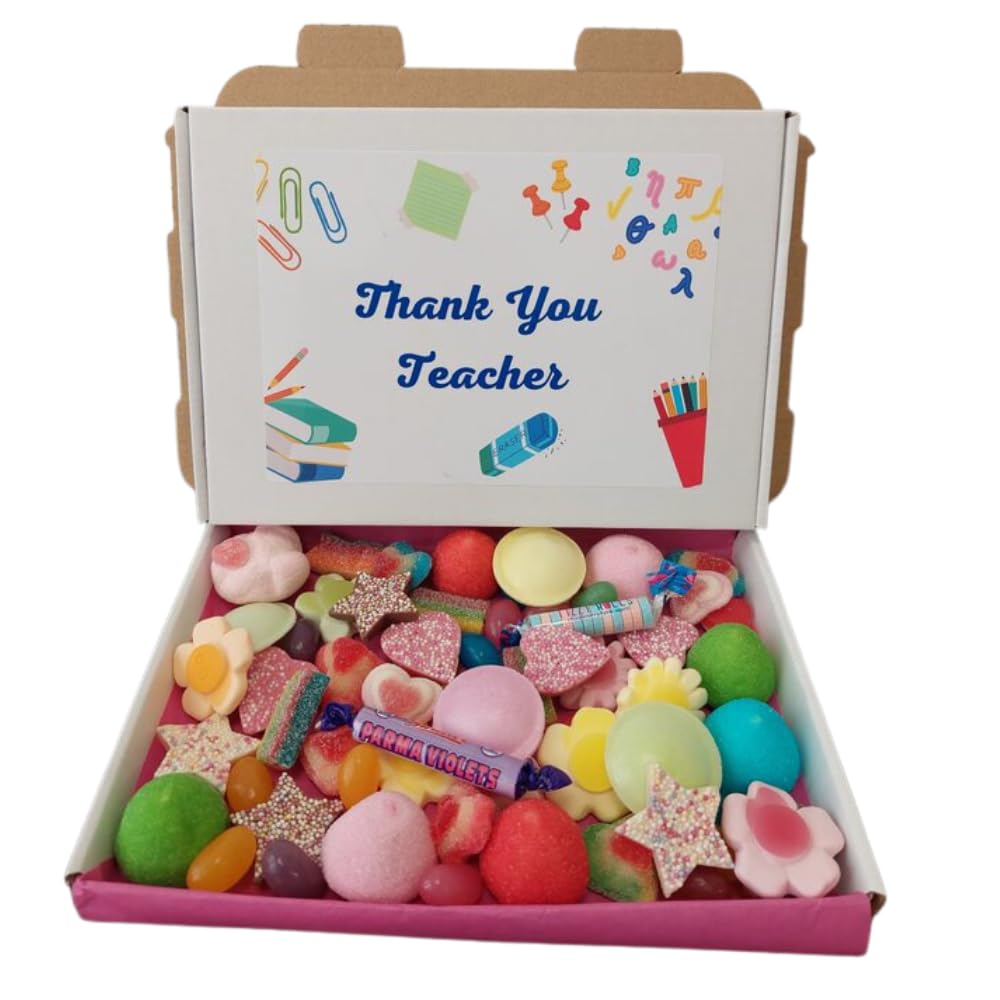 Containing Triple Heart,Fizzy Roll,Parma Violets, Pink Heart, Sugared Multi 3D Heart, Heart Throbs, Jelly Love Heart, Happy Flower, Star, Paint ball. The Ideal Gift: Everyone loves Pick ‘n’ Mix so our Box make the perfect gift for Thank you Teacher. Perfect for occasions like the end of the school year, Teacher Appreciation Week, or special occasions to say "thank you.". Show your teacher how much you value their hard work and dedication with this sweet gift. Express your gratitude to an amazing teacher with this delightful "Thank You Teacher" sweet gift.