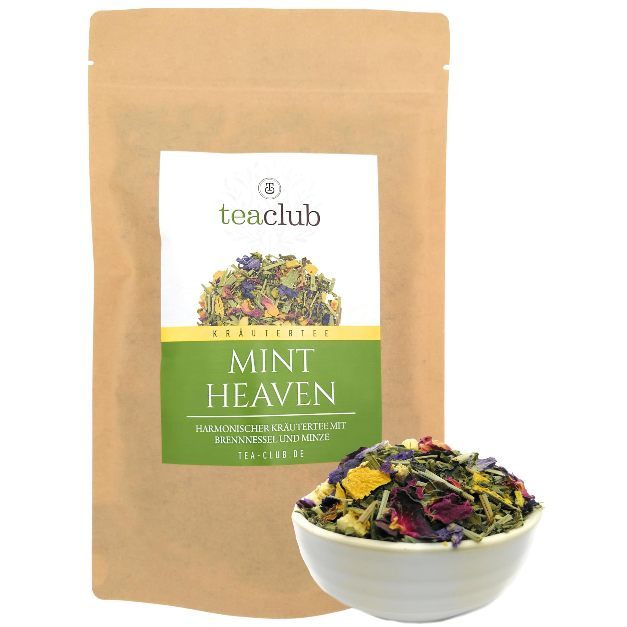 PREMIUM QUALITY Loose leaf herbal tea with an incomparable flavor. The herbal tea is packaged in a flavorless, resealable pouch. Gluten-free, lactose-free, vegan, vegetarian. CAFFEINE-FREE Alkaline peppermint herbal tea blend for a day of well-being, at the office, or in the early evening. Contains no caffeine. NATURAL HERBAL TEA Herbal tea blend made with high-quality ingredients developed by tea and nutrition experts, without additives such as artificial flavors. For everyday enjoyment. ALKALINE TEA Herbal tea made with selected and harmonized ingredients: Nettle leaves, peppermint, lemongrass, orange peel, licorice root, rose petals, mallow petals. HEAVENLY TASTE Fresh and harmonious flavor of tea herbs and the sweetness of licorice root. Infused hot, herbal tea warms up cold days, but can also be enjoyed as iced tea in summer and for sports.QUALITÉ PREMIÈRE Tisane en vrac à la saveur incomparable. La tisane est conditionnée dans un doypack sans saveur avec fermeture à glissière. Sans gluten, sans lactose, végétalien, végétarien. SANS CAFEINE mélange de tisanes alcalines à la menthe poivrée pour une journée de bien-être, au bureau ou en début de soirée. Ne contient pas de caféine. TISANE NATURELLE mélange de tisanes à base d'ingrédients de haute qualité mis au point par des experts en thé et en nutrition, sans additifs tels que des arômes. Pour un plaisir quotidien. THÉ ALKALINE tisane à base d'ingrédients sélectionnés et harmonisés : Feuilles d'ortie, menthe poivrée, citronnelle, écorce d'orange, racine de réglisse, pétales de rose, pétales de mauve. GOÛT HEAVENLY Saveur fraîche et harmonieuse des herbes à thé et douceur de la racine de réglisse. Infusée à chaud, la tisane réchauffe les journées froides, mais se déguste également comme thé glacé en été et pour le sport.TeaClub Tisane alcalinisante en vrac 100g, mélange de tisanes avec ortie citronnelle menthe, bien-être, Mint Heaven