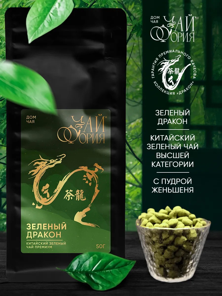 Чай Зеленый Дракон — жемчужина провинции Фуцзянь. Это один из самых полезных и необычных китайских чаев, сочетающий в себе полезные свой-ства корня женьшеня и зеленого чая. Производят чай Зеленый Дракон на ос-нове южнофуцзяньского зеленого чая премиум и измельченного корня женьшеня. Такой микс даёт чаю Зеленый Дракон мощные тонизирующие свойства и уникальные вкусовые ощущения, так как женьшень и зеленый чай — самые популярные чаи Азии.
