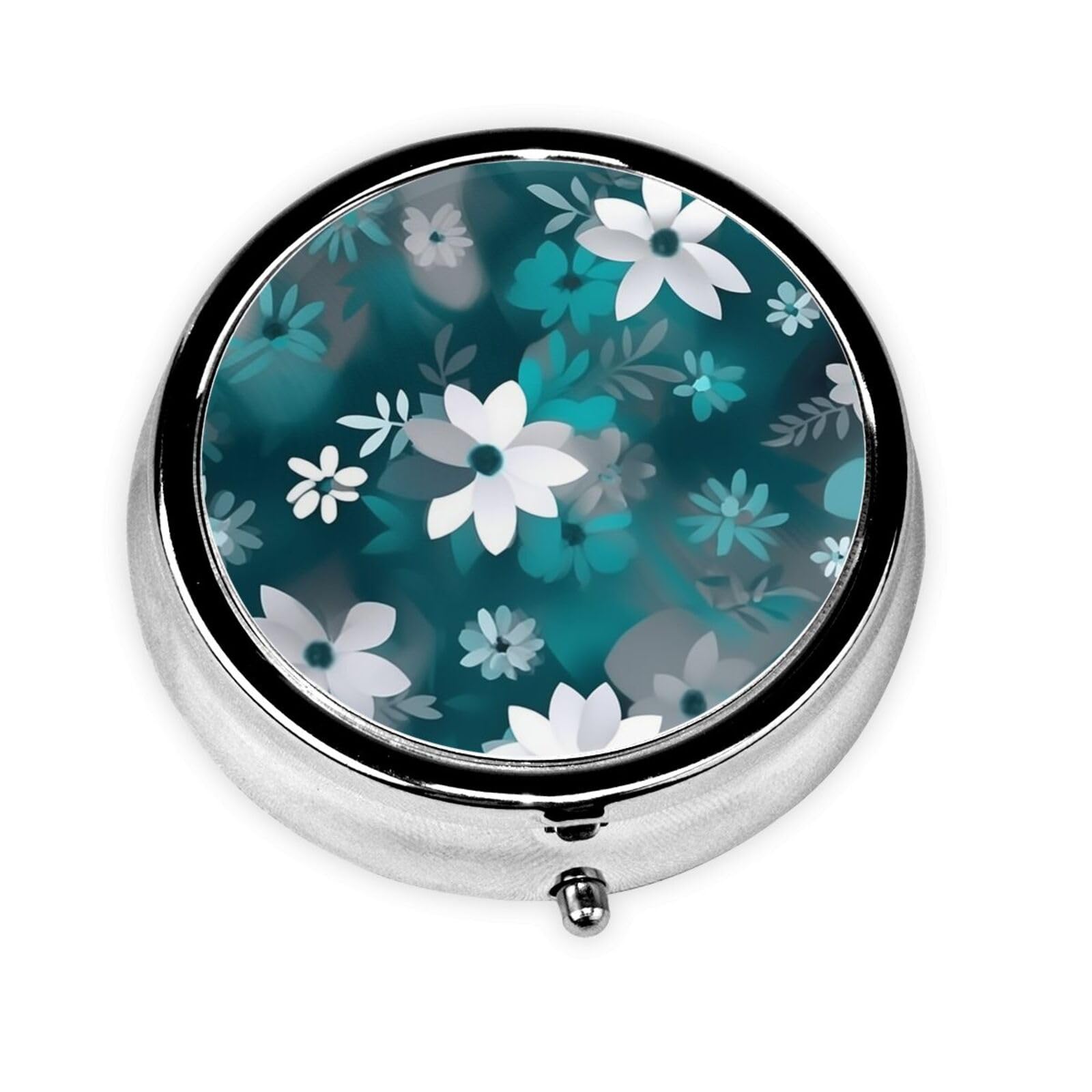 Teal Grey and White Floral Portable Metal Pill Box Round Mini 3-Compartment Plastic Insert hinged Fastening Design Suitable for Small Pills Must-Have for Travel