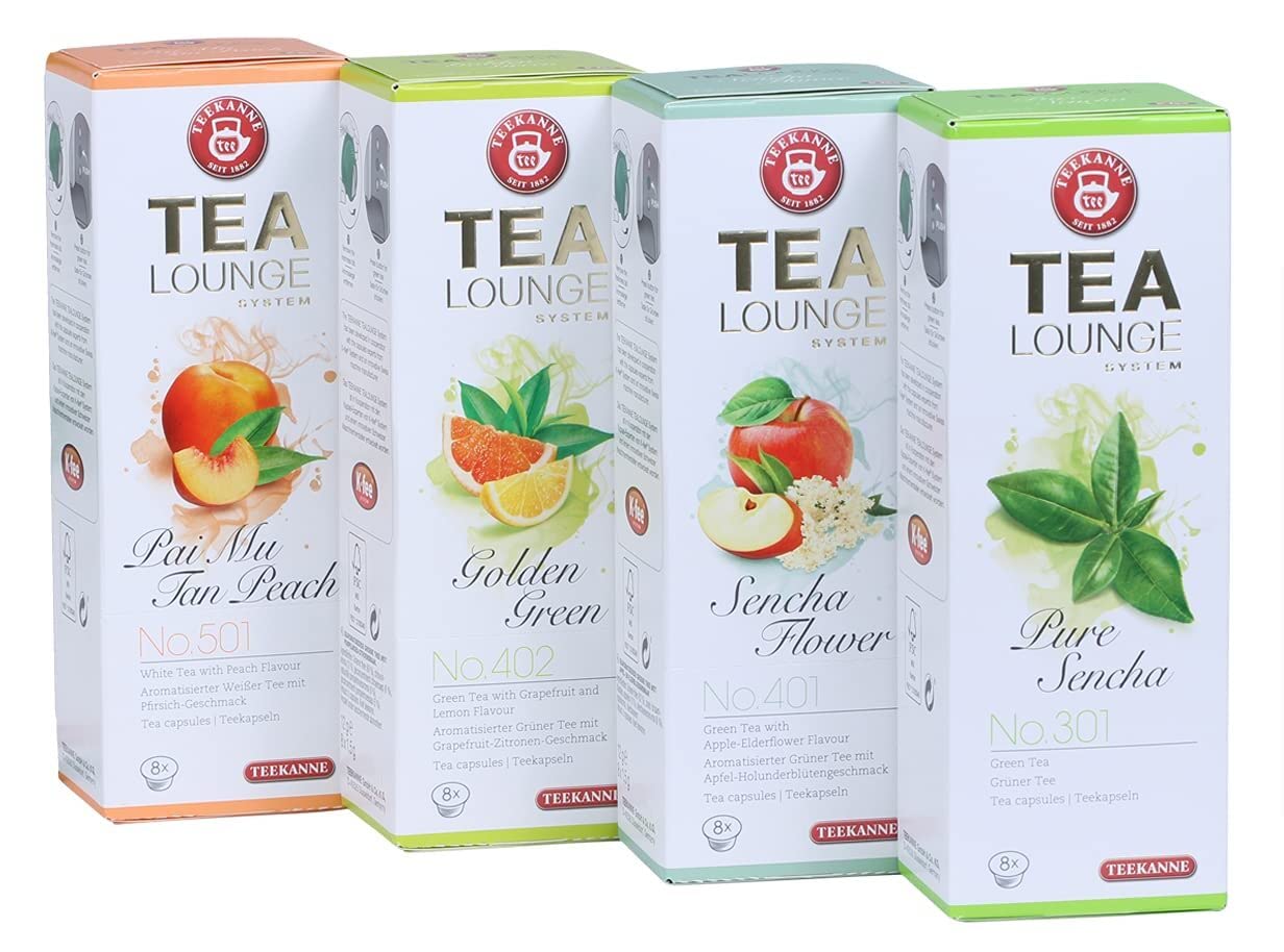 4 refined tea varieties with 8 capsules each. Varieties include: Pure Sencha, Sencha Flower, Golden Green, and Pai Mu Tan Peach. Ideal for all green tea lovers. Tea capsules for the Tealounge System (K-Fee) teapot. Preparation instructions: 1. Remove the aroma seal. Press the button for herbal and fruit tea or squeeze the green tea. INGREDIENTS Ingredients: PAI MU TAN: White tea, peach flavoring, peach juice concentrate. GOLDEN GREEN: Green tea, lemon flavoring, lemon juice concentrate, grapefruit flavoring, grapefruit juice concentrate. SENCHA FLOWER: Green tea, sweet blackberry leaves, apples, elderflower flavoring, apple flavoring, elderflowers. Pure Sencha: Green tea. INSTRUCTIONS Remove the aroma seal, then press the appropriate flavor for herbal and fruit tea or green tea. SAFETY WARNING Contains caffeine. Not recommended for children or pregnant women. See moreThéière Tealounge Capsules - Assortiment de thé vert avec 4 variétés (32 capsules)DESCRIPTION DU PRODUIT DESCRIPTION DU PRODUIT 4 variétés de thé raffinées avec 8 capsules chacune. Les variétés sont incluses : Pure Sencha, Sencha Flower, Golden Green et Pai Mu Tan Peach. Idéal pour tous les amateurs de thé vert. Capsules de thé pour théière Tealounge System (K-Fee) Conseils de préparation : 1. Retirez le sceau d'arôme. Bouton pour thé aux herbes et aux fruits ou Pressez le thé vert. INGRÉDIENTS Ingrédients : PAI MU TAN : thé blanc, arôme de pêche, concentré de jus de pêche. GOLDEN GREEN : thé vert, arôme de citron, concentré de jus de citron, arôme de pamplemousse, concentré de jus de pamplemousse. SENCHA FLEUR : thé vert, feuilles de mûre douces, pommes, arôme de fleur de sureau, arôme de pomme, fleurs de sureau. Pure Sencha : thé vert. MODE D'EMPLOI Retirez le sceau aromatique, puis appuyez sur le goût approprié pour le thé aux herbes et aux fruits ou le thé vert. AVERTISSEMENT DE SÉCURITÉ Contient de la caféine. Non recommandé pour les enfants et les femmes enceintes. Voir plus