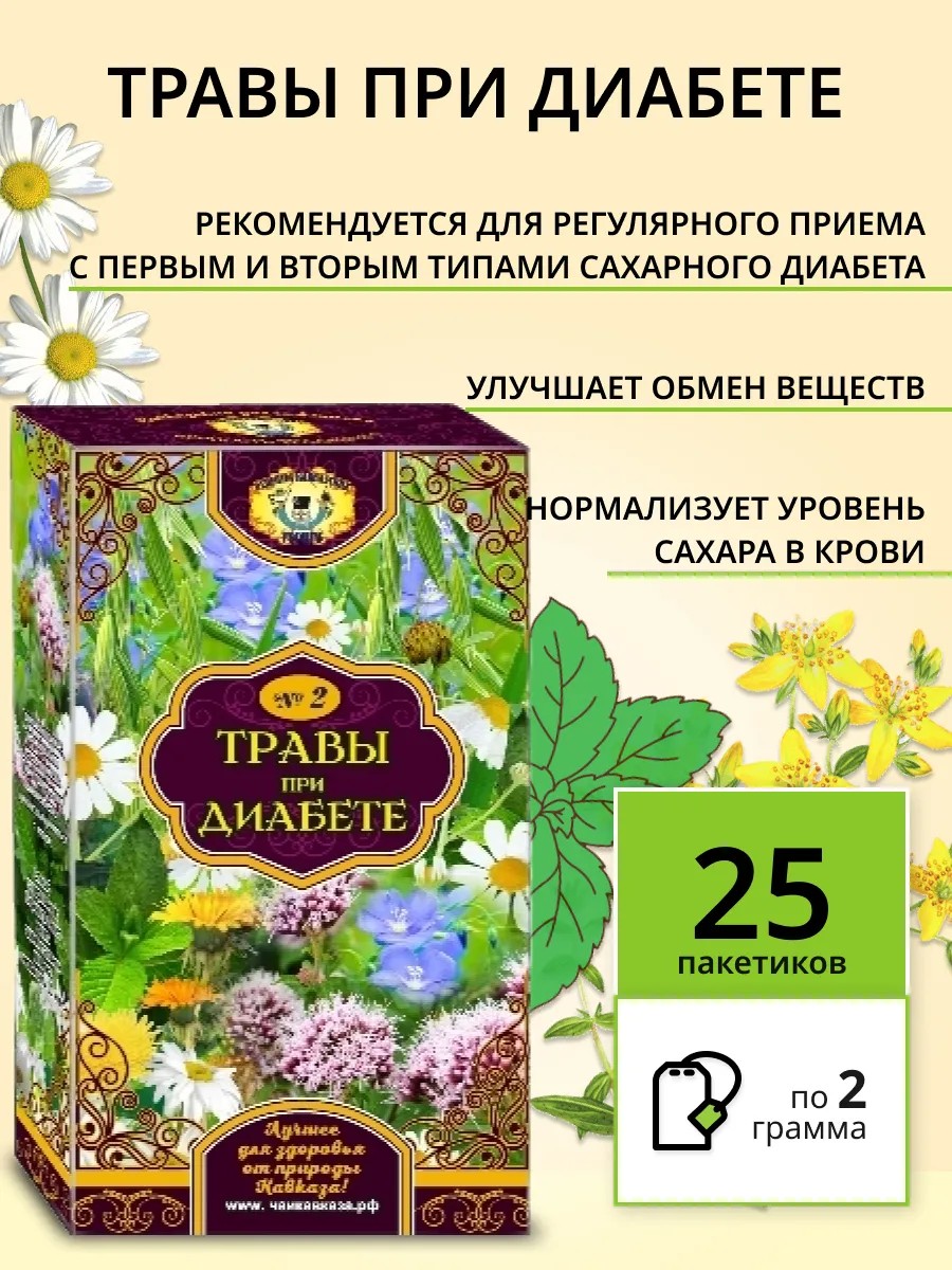Травяной фиточай «Травы при диабете» применяется в комплексном лечении и профилактике диабета. Это комплекс из 8 трав, который снижает уровень сахара и холестерина, укрепляет сосуды, нормализует давление.