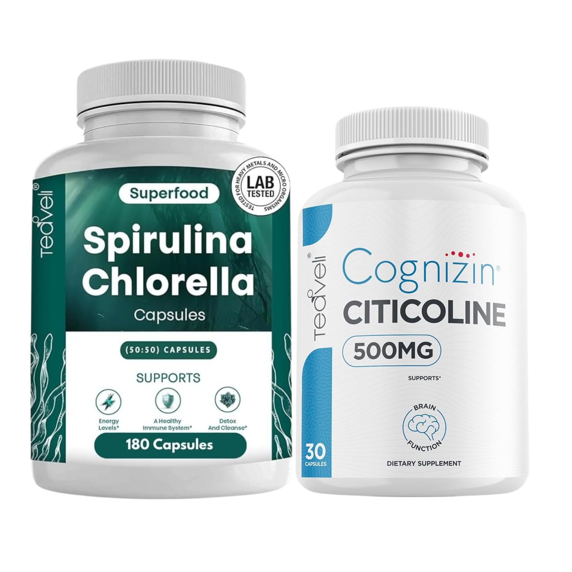 A wellness bundle combining Spirulina Chlorella capsules for natural detox and nutrient support, and Citicoline to enhance cognitive function and mental clarity. Perfect for overall vitality and brain health.