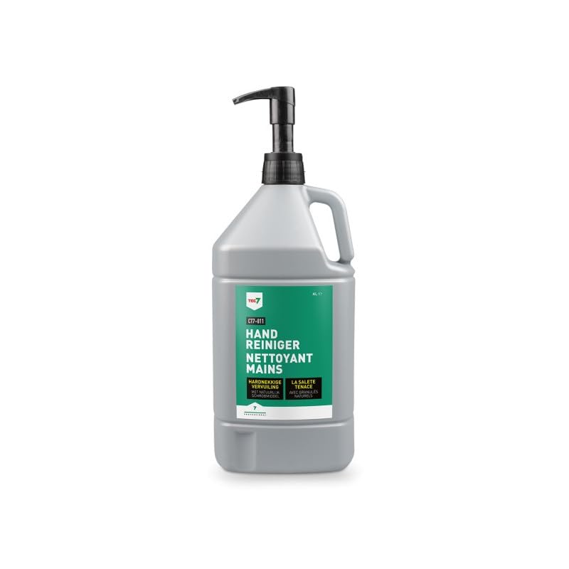 CT7-811 Hand Cleaner - Hand Soap for Tough Dirt - Tec7 Tec7 CT7-811 is a hand soap for tough dirt such as oil, grease, paint, etc. Features: Quickly removes grease, oil, paint, ink, glue, resin, silicone, and tar. This hand soap quickly eliminates even the toughest dirt without irritating the skin. The gentle, natural granules ensure deep pore cleansing while respecting the skin. Furthermore, these granules do not contribute to the formation of microplastics. Concentrated formula, economical to use. Technical Specifications: Form: gel. Color: yellow. Scent: lemon. Density (at 20 C): 0.99 g cm³. Water Solubility: emulsifies. pH Value: 6.5. Viscosity (at 20 C): 175,000 mPa Shelf life: 12 months, in a closed container, stored in a cool place and protected from frost. Packaging: 3.8 L.Tec7 CT7-811 is a hand soap for tough dirt such as oil, grease, paint, etc.CT7-811 Nettoyeur à main - Savon à main pour saleté tenace - Tec7-3,8 LDESCRIPTION DU PRODUIT CT7-811 Nettoyant mains - Savon mains pour la saleté tenace - Tec7Tec7 CT7-811 est un savon mains pour la saleté tenace comme l'huile, la graisse, la peinture, etc.Caractéristiques :Enlève rapidement la graisse, l'huile, la peinture, l'encre, la colle, la résine, le silicone et le goudron.Ce savon pour les mains élimine rapidement la saleté la plus tenace sans irriter la peau.Les granulés naturels doux assurent une action en profondeur des pores en respectant la peau.De plus, ces granulés ne contribuent pas à la formation de micro-plastiques.Formule concentrée, économique à l'usage.Spécificités techniques :Forme: gel.Couleur jaune.Parfum: citron.Densité (à 20 C): 0,99 g cm³Hydrosolubilité: émulsionne.Valeur pH: 6,5.Viscosité (à 20 C): 175000 mPa s.Durée de conservation: 12 mois, dans un emballage fermé, conservé au frais et à l'abri du gel.Conditionnement :3,8 L.Tec7 CT7-811 est un savon mains pour la saleté tenace comme l'huile, la graisse, la peinture, etc.