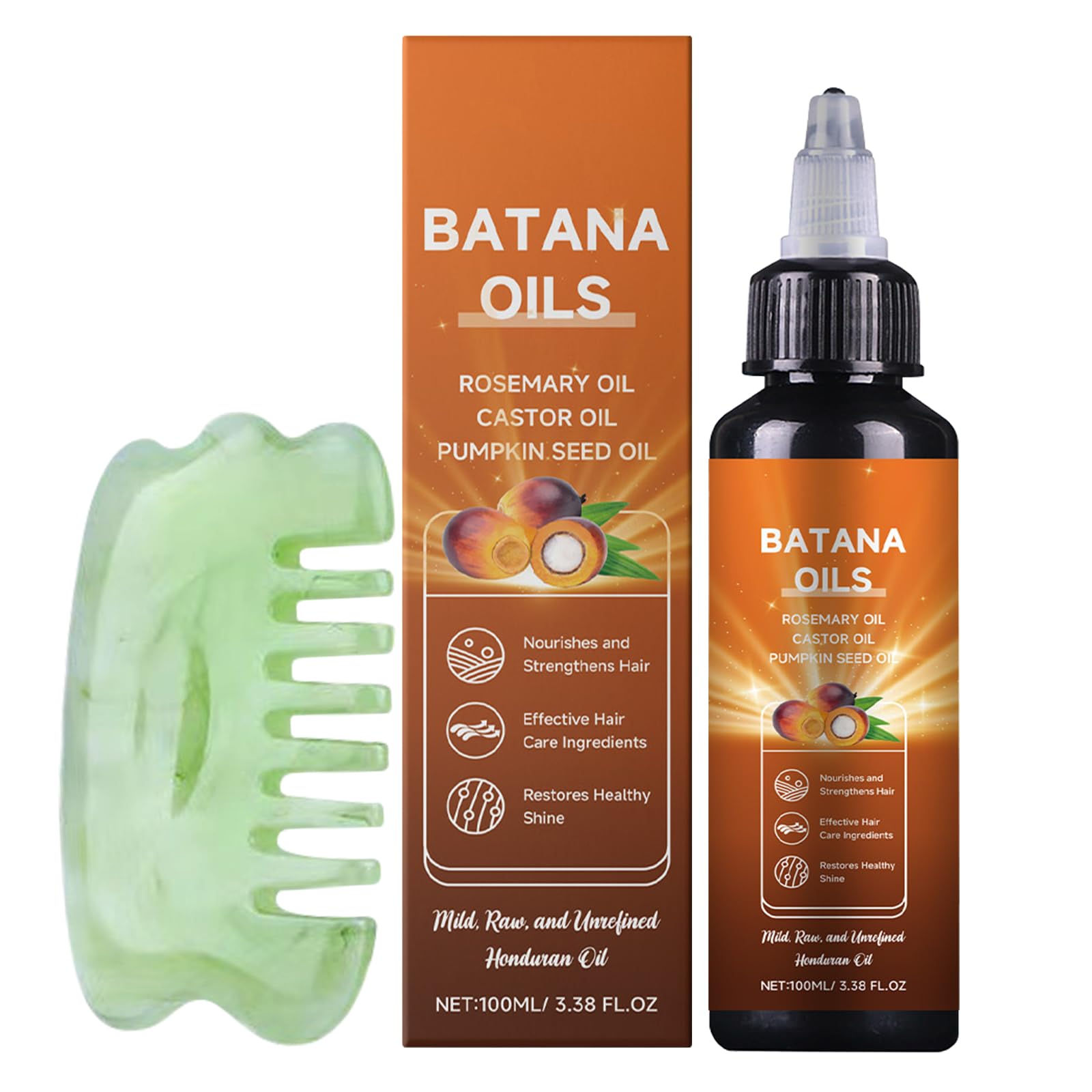 Instructions for use: Apply an appropriate amount of Batana oil for hair to the scalp and hair and massage with your fingers for 2-3 minutes until absorbed. Use 1 or 2 times a day every day for flawless hair. Product specification: Net content: 60 ml bottle. Quantity: 2 bottles Packaging: individually packed Product list: 1 x Batana oil for hair. 1 x massage comb Tips: Due to the influence of monitor and light, please refer to the actual product received. Store it in a dry and ventilated place and avoid direct sunlight. For the first use, you can choose a small area of skin to apply it, stop using it immediately if you feel unwell. INSTRUCTIONS FOR USE Apply an appropriate amount of Batana oil for hair to the scalp and hair and massage with your fingers for 2-3 minutes until absorbed. Use 1 or 2 times a day every day for flawless hair. SAFETY WARNING none See moreSuitable for all hair types: the Batana hair oil is suitable for all hair types. Whether you have curly hair, smooth hair, damaged hair or thin, dry hair, you can use Batana hair oil to improve hair structure and give your hair volume and shine. Nourishes and Moisturizes: Batana hair oil helps to hydrate and soften hair, deeply nourishes hair, controls sebum, maintains healthy scalp, enhances shine, moisturizes dry hair, reduces frizz, hair fall and hair breakage. Light texture, easy to absorb: Batana hair oil is safe and warm, light oil texture, refreshing non-greasy, easy to absorb, does not clog pores, leaving hair fresh and fluffy after use. Use: Apply an appropriate amount of Batana hair oil to the scalp and hair and massage with your fingers for 2-3 minutes until absorbed. Use it 1 to 2 times a day for flawless hair, every day. Batana hair oil set: 1 x 100 ml Batana hair oil, 1 x massage comb, suitable for all hair types, promotes hair growth, improves hair structure, makes hair fuller and thicker.Batana olie voor haar, 100 ml, biologische Batana-olie voor haargroei Gebruiksaanwijzing: Breng een geschikte hoeveelheid Batana-olie aan voor haar op hoofdhuid en haar en masseer met je vingers 2-3 minuten lang in tot het is ingetrokken. Gebruik elke dag 1 of 2 keer per dag voor onberispelijk haar. Specificatie van het product: Netto inhoud: 60 ml fles. Hoeveelheid: 2 flessen Verpakking: afzonderlijk verpakt Productlijst: 1 x Batana-olie voor haar. 1 x massagekam. Tips: Als gevolg van de invloed van monitor en licht, verwijzen wij u naar het daadwerkelijk ontvangen product. Bewaar het op een droge en geventileerde plaats en vermijd direct zonlicht. Voor het eerste gebruik kun je een klein stukje huid kiezen om het aan te brengen, stop onmiddellijk met het gebruik als je je onwel voelt. GEBRUIKSAANWIJZING Breng een geschikte hoeveelheid Batana-olie aan voor haar op hoofdhuid en haar en masseer met je vingers 2-3 minuten lang in tot het is ingetrokken. Gebruik elke dag 1 of 2 keer per dag voor onberispelijk haar. VEILIGHEIDSWAARSCHUWING geen Meer bekijkenGeschikt voor alle haartypes: de Batana haarolie is geschikt voor alle haartypes. Of je nu krullend haar, glad haar, beschadigd haar of dun, droog haar hebt, je kunt Batana haarolie gebruiken om de haarstructuur te verbeteren en je haar volume en glans te geven. Voedt en hydrateert: Batana haarolie helpt om het haar te hydrateren en zacht te maken, voedt het haar diep, controleert talg, behoudt een gezonde hoofdhuid, versterkt de glans, hydrateert droog haar, vermindert kroezen, haaruitval en haarbreuk. Lichte textuur, gemakkelijk te absorberen: Batana haarolie is veilig en warm, lichte olietextuur, verfrissend niet vettig, gemakkelijk te absorberen, verstopt de poriën niet, na gebruik van het haar fris en pluizig. Gebruik: breng een geschikte hoeveelheid Batana haarolie aan op de hoofdhuid en het haar en masseer met je vingers 2-3 minuten lang in tot het is ingetrokken. Gebruik het 1 tot 2 keer per dag voor onberispelijk haar, elke dag. Batana haarolieset: 1 x 100 ml Batana haarolie, 1 x massagekam, geschikt voor alle haartypes, bevordert de haargroei, verbetert de haarstructuur, maakt het haar voller en dikker.
