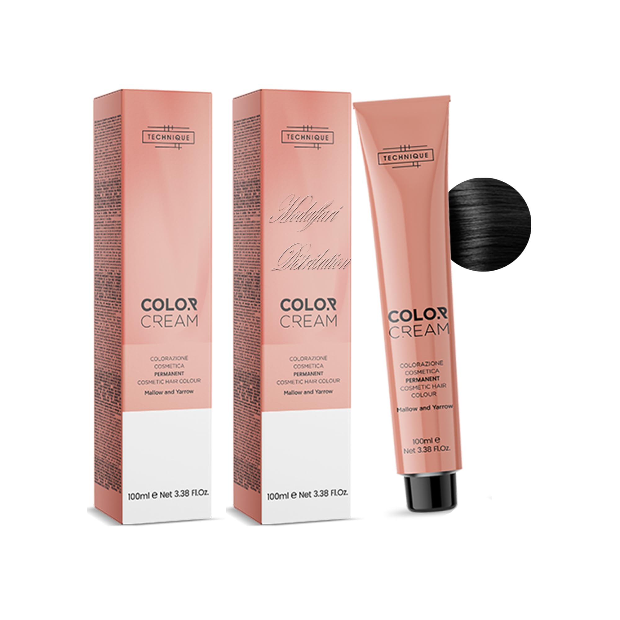 Color Cream, a new generation professional cosmetic hair color. Formulated with highly pure coloring agents and Achillea, Malva, and rice proteins to repair and enrich the hair fiber, leaving it soft and voluminous. For professional use. 100ml tube. For even and safe coloring, Color Cream was born, the new cosmetic hair color that is revolutionizing the world of hairstyling. A high-tech solution for your hair, the cream adheres to each strand, creating a coloring film that guarantees surprising and unique touch-ups. Its delicate formula does not constrict the hair structure on the contrary, it invigorates it because it is enriched with beneficial natural substances: Achillea, long known for its healing properties, regenerates the hair shaft from root to tip, giving the hair tone Malva makes hair soft and silky thanks to its vitamin composition (B1, B2, C, and Carotene) Rice proteins generate hydration and combat hair fragility, restoring body and protection.Sold by Modaffari Distribution. Its delicate formula doesn't damage the hair structure on the contrary, it invigorates it because it is enriched with beneficial natural substances: Yarrow, long known for its healing properties, regenerates the hair shaft from root to tip, giving the hair its color Mallow makes hair supple and silky thanks to its vitamin composition (B1, B2, and C, Carrot E) Rice proteins generate hydration and combat hair fragility, restoring body and protection. For even and safe coloring, Color Cream was born, the new cosmetic hair color that is revolutionizing the world of hair styling. A high-tech solution for your hair, the cream adheres to the hair, creating a coloring film that guarantees surprising and unique touch-ups. Formulated with highly pure coloring substances and with Yarrow, Mallow, and Rice Proteins to repair and enrich the hair fiber, giving softness and volume. For professional use. 100 ml tube. Technique Color Cream 2 bottles of 100 ml black 1.Color Cream, coloration cosmétique professionnelle nouvelle génération. Formule avec des substances colorantes hautement pures et avec Achillea, Malva et protéines de riz pour réparer, enrichir la fibre et donner douceur et volume. Utilisation professionnelle Tube de 100 ml Pour une coloration homogène et sûre est née Color Cream, la nouvelle coloration cosmétique qui révolutionne le monde du coiffage. Solution hi-tech pour vos cheveux, la crème se fixe sur chaque cheveu en créant un film colorant qui garantit des retouches surprenantes et uniques. Sa formulation délicate n'étroite pas la structure capillaire, au contraire, elle renvigorera car elle enrichie avec des substances naturelles bienfaisantes : l'Achillea, connu depuis toujours pour ses propriétés cicatrisantes, régénère la tige à la racine en donnant du ton au cheveu la Malva rend les cheveux doux et soyeux grâce à sa composition vitaminée (B1, B2 et C, Carotéeeee). ) Protéines du Le riz génère l'hydratation et luttent la fragilité du cheveux, en lui rendant corps et protection.Vendu par Modaffari Distribution. Sa formule délicate n'entraîne pas la structure capillaire, au contraire, la revigorce car elle enrichie avec des substances naturelles bénéfiques : l'Achillea, connue depuis toujours pour ses propriétés cicatrices, régénère la tige à la racine en donnant ton au cheveu la mauve rend les cheveux souples et soyeux grâce à sa composition vitamine (B1, B2 et C, Carottie E) les protéines du riz génèrent l'hydratation et combattent la fragilité du cheveu, en lui restituant le corps et la protection. Pour une coloration homogène et sûre est née Color Cream, la nouvelle coloration cosmétique qui révolutionne le monde de l'hair styling. Solution hi-tech pour vos cheveux, la crème se fixe sur un cheveu en créant un film colorant qui garantit des retouches surprenantes et uniques. Formule avec des substances colorants hautement pure et avec Achillea, Mauve et Protéines du Ris, pour réparer, enrichir la fibre et donner douceur et volume. Utilisation professionnelle Tube de 100 ml. Technique Color Cream 2 flacons de 100 ml noir 1.TECHNIQUE COLOR CREAM - TINTA 100 ML (1 noir) 2 pièces