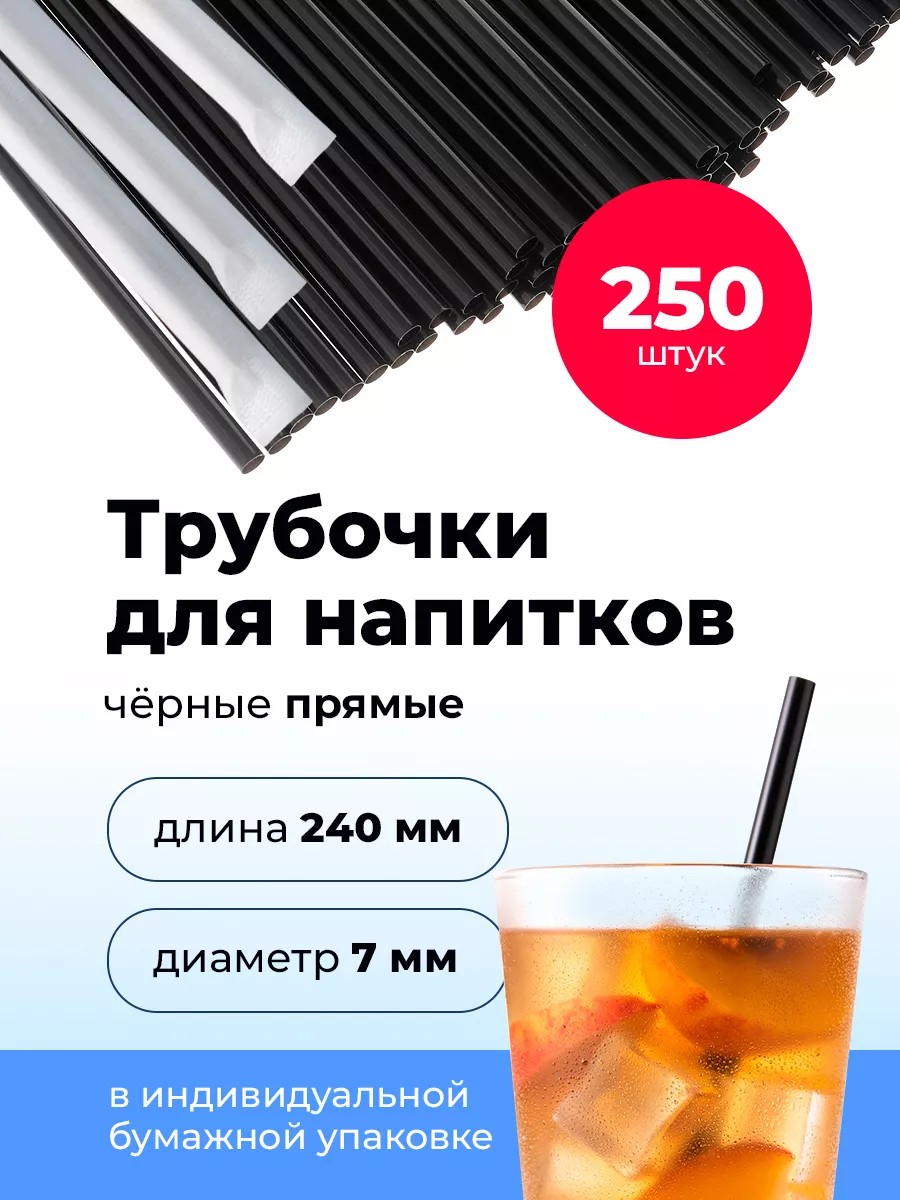 Трубочки для напитков, коктейлей в индивидуальной бумажной упаковке прямые D 7мм L 240мм, пластик, черные, 250 шт. Индивидуальная бумажная упаковка. Одноразовые коктейльные трубочки незаменимы в барах, ресторанах, кафе, на праздниках - везде, где подаются коктейли и любые другие прохладительные напитки, а также чай и кофе.