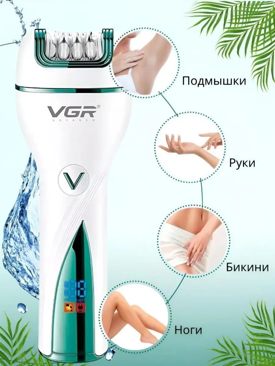 The VGR V-728 3-in-1 cordless and rechargeable women's epilator, facial electric epilator, hair removal depilator, women's razor, women's shaving trimmer, leg and body hair removal, 18 tweezers with a charging indicator, white and blue. This VGR V-728 epilator is designed to remove unwanted hair for up to 4 weeks! This women's electric epilator is designed for both dry and wet epilation. Apply shower gel or liquid soap to the discs or mesh; the discs rotate to create foam, resulting in a smooth glide. This electric epilator operates on both mains and battery power. Depilation with a shaving epilator is the optimal option for removing unwanted body hair. The device is always at hand, requires no special preparation before use, and requires no additional costs other than the price. The principle of operation of the body trimmer is as follows: several pairs of metal discs rotate and, when touching, grab the hairs like tweezers, removing them by the root. Characteristics of the women's epilator: Body material: plastic; Tweezers coating material: metal; Battery charging time: 90 min; Operating time: 60 min; Number of tweezers: 18; Speeds: 1; Power: 5 W; Power supply: battery and mains; Dimensions: 16x6x3 cm Weight: 135 g. Package contents: Epilator - 1 pc, USB cable - 1 pc, Attachments - 3 pcs, Cleaning brush - 1 pc, Instructions - 1 pc, Box - 1 pc. How to use: Inspect the areas where treatment is planned. Please note that you cannot epilate areas with convex moles, warts, as well as with noticeable spider veins and protruding veins. For these areas, it's best to use a different method, such as an electric razor or trimmer, which may come with an attachment. If you've recently had hair removal, wait a couple of days for the hairs to grow back to a sufficient length, about 3 mm on average. Otherwise, the device will have difficulty grasping stubble, and the hair removal procedure will take longer. If the hairs are too long, they should be trimmed or trimmed to 5 mm. Otherwise, the pain may be greater, and the women's epilator will rip the hairs without removing the roots. It's recommended to take a bath and steam your skin at least 1 hour before shaving, then apply a scrub or massage thoroughly with a hard washcloth. These steps will improve the quality of the epilation. If you plan to epilate your underarms and bikini area, treat these areas with an alcohol solution or skin antiseptic. You should also completely wipe the head of the electric women's epilator. To ensure a good adhesion of the bikini epilator to the hair, dust the skin with baby powder. This will not only thicken the epilator but also absorb excess moisture and sebum.