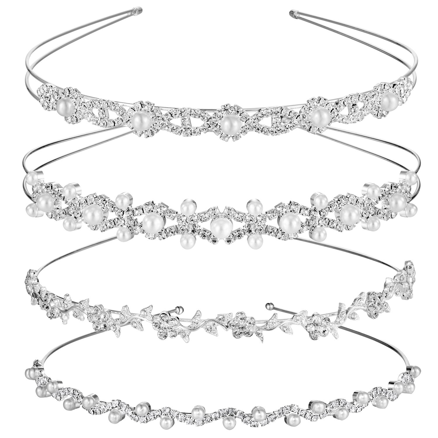 Fantastic hair accessories: these silver rhinestone headbands are good gifts for your lover, friends, daughter, mother, wife and coworkers. Suitable occasion: good choice for bride and bridesmaids to wear in the wedding; Also suitable for party, school prom, banquet and other themed events. Material: made with faux pearl headband, alloy and clear rhinestone crystals in silver plated metal settings. Size: each rhinestone headband is about 14 cm/ 5.51 inch in length, 13 cm/ 5.12 inch in width. Different design headbands: 4 pieces headbands are different, one is flower and leaves headband, and the other three are rhinestones faux pearls headbands.