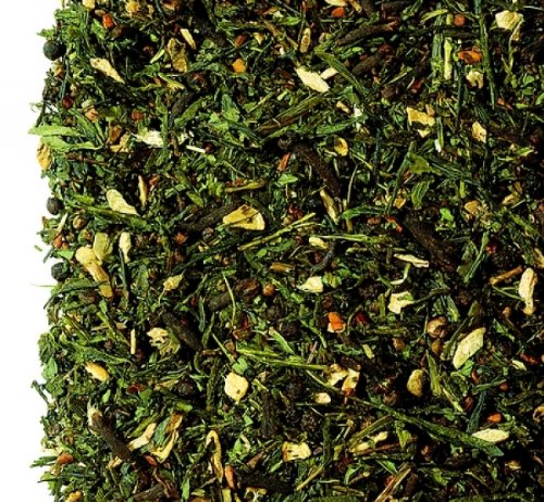 Combined with green tea, the typical ingredients of chai create a successful blend. Thanks to the green tea, this blend is slightly cooler and less intense than most other types of chai. The spicy aroma of cloves and the freshness of curly mint take center stage. Even iced, it's a true delight. Ingredients: green tea, cardamom seeds, ginger pieces, cloves, black peppercorns, cinnamon pieces, curly mint, flavoring. Preparation recommendation: Quantity: 2 to 3 painted teaspoons per liter - Water temperature: 75 to 80 C - Steeping time: 2 to 3 minutes.