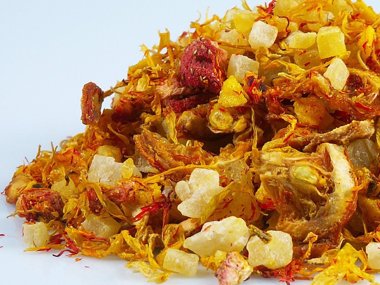 If you enjoy a mild fruit tea and love exotic mango, then you've come to the right place. The mango and pineapple cubes, along with orange wedges, bring a sweet and smooth note to the cup. Ingredients: Pineapple cubes (pineapple, sugar, additive: citric acid), mango cubes (mango, sugar, calcium chloride, additive: citric acid), orange wedges, flavoring, mango fruit granules (glucose syrup, wheat, mango pulp, thickener: E401), strawberry pieces, calendula flower leaves, thistle coloring, vitamin blend (vitamin C, niacin, vitamin E, pantothenic acid, vitamins B6, B2, B1, folic acid, biotin, vitamin B12, excipient: maltodextrin). Preparation recommendation: Quantity: 15-20 g l. Water temperature: 100 C. Drawing time: 5 to 10 minutes.Mango Mambo (anciennement mangue Tango) 100 g dans un pack de protection des arômesDESCRIPTION DU PRODUIT Si vous aimez un thé aux fruits doux et que vous aimez la mangue exotique, alors vous êtes au bon endroit. les cubes de mangue et d'ananas, ainsi que les coins d'orange apportent une note douce et douce à la tasse. Ingrédients : cubes d'ananas (ananas, sucre, additif : acide citrique), cubes de mangue (mangue, sucre, chlorure de calcium, additif : acide citrique), cubes de mangue (mangue, sucre), coins d'orange, arôme, granulés de fruits de mangue (sirop de glucose). Blé, mangue. oppurée, épaississant : E401), morceaux de fraise, feuilles de fleurs de calendula, chardon colorant, mélange de vitamines (vitamine C, niacine, vitamine E, acide pantothénique, vitamine B6, B2, B1, acide folique, biotine, vitamine B12, excipient : maltodextrine). Recommandation de préparation : quantité : 15-20 g l Température de l'eau : 100 Degré C. Temps de tirage : 5 à 10 minutes