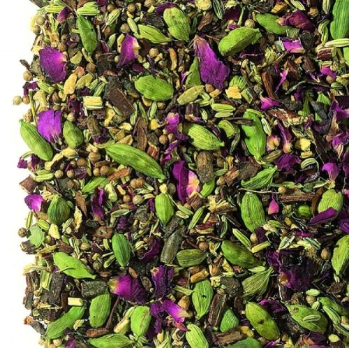 According to Ayurvedic principles, this blend is soothing and balancing, which confirms the pleasure of this tea. Sweet and mellow in taste, very well-rounded and delicately floral, this blend invites you to feel truly comfortable and at ease. The proportion of rose petals adds a special touch. According to Ayurvedic principles, this tea supports the Pitta dosha. Ingredients: Cinnamon pieces, whole cardamom pods, licorice root, coriander, fennel, ginger pieces, rose petals. Note: This blend contains licorice – those with high blood pressure should avoid excessive consumption. Preparation recommendation: Quantity: 3 to 4 tablespoons per liter. Water temperature: 100 C. Infusion time: 5-10 minutes