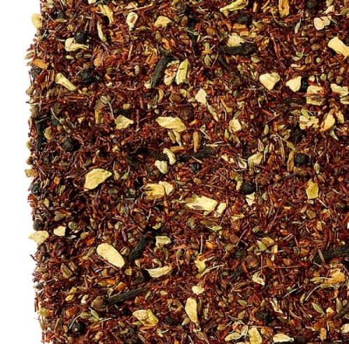 The well-rounded taste of Rooibos tea provides an ideal base for the added ingredients. What may seem unsuitable at first glance is an extraordinarily successful creation with pepper-cinnamon notes, also suitable for those who want or need to avoid caffeine. Ingredients: Rooibos, anise seeds, ginger pieces, black peppercorns, cardamom seeds, cinnamon pieces, cloves, and flavoring. Preparation recommendation: Quantity: 4 to 5 teaspoons per liter. Water temperature: 100 C. Steeping time: 8-10 minutes
