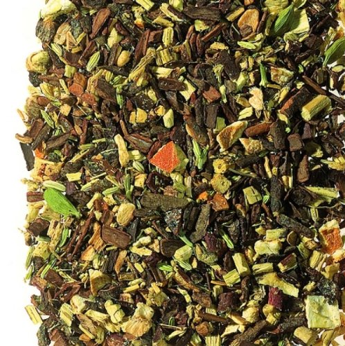 Spicy and sweet, with a hint of licorice, this blend of aromatic herbs is sure to please many herbal tea lovers. This tea lives up to its name. Invigorating yet balanced and pleasantly aromatic, this blend allows you to pause and relax for a few moments of pure enjoyment. According to Ayurvedic teachings, this tea supports the Vata dosha. Ingredients: Cinnamon pieces, licorice root, ginger pieces, fennel, orange peel, whole cardamom pods. Note: This blend contains licorice – those with high blood pressure should avoid excessive consumption. Preparation recommendation: Quantity: 3 to 4 tablespoons per liter. Water temperature: 100 C. Infusion time: 5-10 minutes