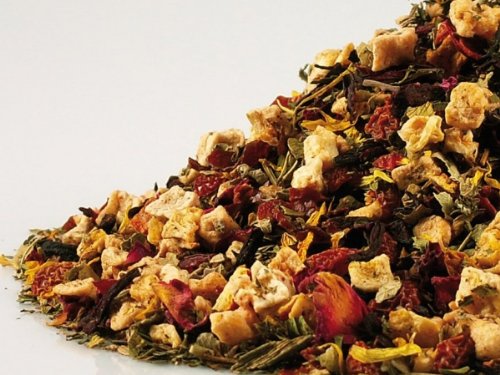 DESCRIPTION DU PRODUIT Vous n'oublierez jamais cette saveur de mangue lilas ! Essayez cette combinaison d'ingrédients raffinés : morceaux de pomme, fleurs d'hibiscus, écorces de cynorrhodon, feuilles de menthe poivrée, feuilles de mûre, graines d'anis, graines de fenouil, feuilles de framboise, feuilles de fraisier, feuilles de noisette, écorces d'orange, fleurs de calendula, pétales de tournesol, pétales de rose, plantain, fraises, feuilles de mélisse et arôme. Recommandation de préparation : quantité : 20-25 g l. Température de l'eau : 100 C. Temps d'infusion : 5-10 minutes