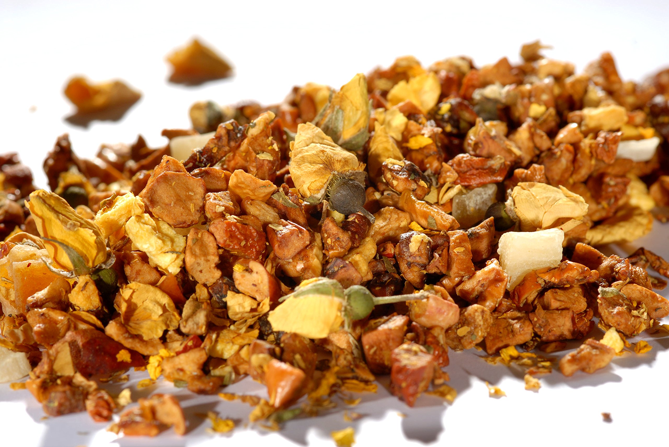 A special apple-pear blend with a subtle hint of mirabelle plum. Ingredients: apple pieces (58 ), pear pieces (9 ), pineapple (pineapple, sugar, acidifier: citric acid), mango (mango, sugar, acidifier: citric acid), rose buds, orange granules (concentrated orange juice, orange cells), acidifier: tartaric acid, flavorings, sunflower flowers.