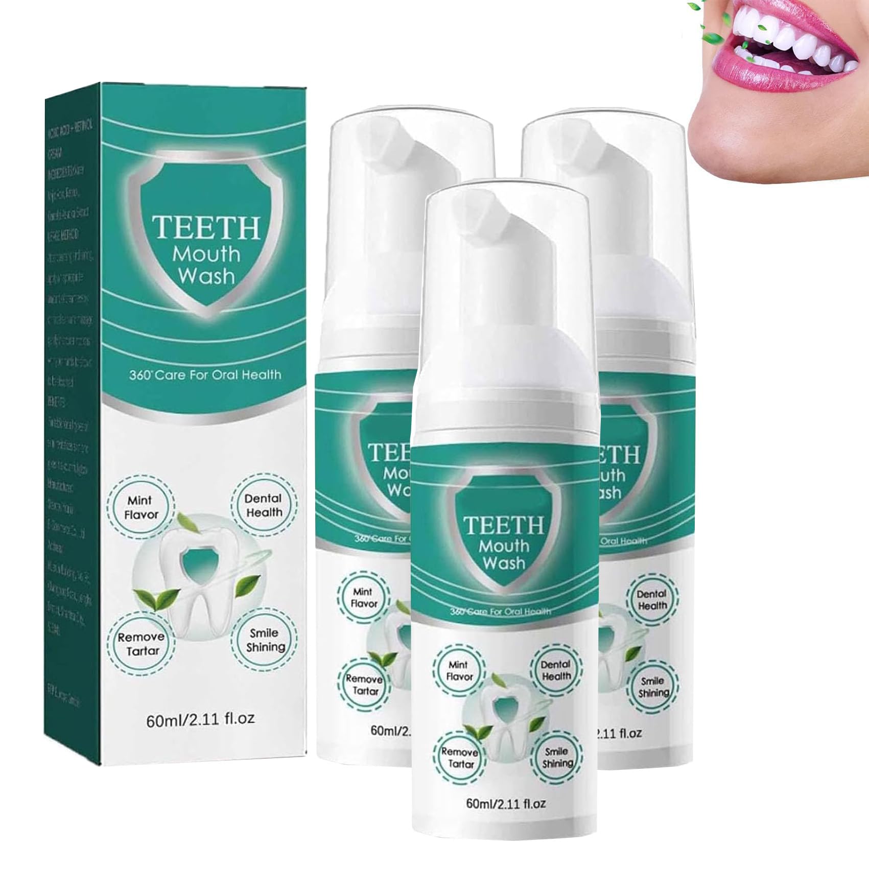 How to use: 1. Press a reasonable amount of foam into the mouth, spit out the foam in 10-15 seconds and you will feel that your mouth is immediately refreshed. 2. Press the right amount of foam on your toothbrush, brush your teeth gently and coated tongue for 2-3 minutes for cleaning and refreshment. Specification: Name: Teeth Total Care mouthwash Net content: 60ml 1 floz Shelf life: 3 years Package contains: 1 2 3 hours × teeth Total care mouthwash Annotation: 1. We tried our best to present the actual picture, but it can be differences in the colors due to the screen resolution, monitor setting, mobile app, viewing angle and other photographic elements. 2. The product size is measured manually on the actual product, it can be an error of 1 2cm.gently and yet effective : Teeth Total Care Mund flushing offers a gentle yet effective solution.The unique ultra -fine foam cleans thoroughly without causing irritation, and thus ensures a pleasant experience with every application.Sustainable results : This mouthwash is recommended for the long -term application and is an indispensable part of your daily routine and an ideal gift for family and friends who want a bright smile.Simple application : Enjoy the comfort of Teeth Total Care Mouthwash.Simply put a blob on your toothbrush and brush as usual to get brighter teeth and fresher breath.Natural ingredients : Our total care mouthwash consists of high -quality ingredients and ensures bright white teeth, dramatic brightening results and a fresh breath to protect gums and teeth.Advanced Whitening Technology : Teeth Total Care Mouthwash contains an advanced whitening foam tooth pasta.The fast -acting formula ensures thorough cleaning and at the same time prevents caries and promotes healthy gums.Wie verwenden: 1. Drücken Sie eine angemessene Menge des Schaums in den Mund, spucken Sie den Schaum in 10-15 Sekunden aus und Sie werden spüren, dass Ihr Mund sofort erfrischt ist. 2. Drücken Sie die richtige Menge Schaum auf Ihre Zahnbürste, bürsten Sie sanft Ihre Zähne und beschichtete Zunge für 2-3 Minuten zur Reinigung und Erfrischung. Spezifikation: Name: Teeth Total Care Mundspülung Netto Inhalt: 60ml 1 Floz Haltbarkeit: 3 Jahre Paket enthält: 1 2 3Stk × Zähne Total Care Mundspülung Anmerkung: 1. Wir haben unser Bestes versucht, um das tatsächliche Bild zu präsentieren, aber es kann Unterschiede in den Farben aufgrund der Bildschirmauflösung, Monitoreinstellung, Mobile App verwenden, Betrachtungswinkel und andere fotografische Elemente sein. 2. Die Produktgröße wird manuell auf dem tatsächlichen Produkt gemessen, es kann ein Fehler von 1 2cm sein.Sanft und doch wirksam:Teeth Total Care Mundspülung bietet eine sanfte und doch wirksame Lösung. Der einzigartige ultrafeine Schaum reinigt gründlich, ohne Reizungen zu verursachen, und sorgt so für ein angenehmes Erlebnis bei jeder Anwendung. Nachhaltige Ergebnisse:Diese Mundspülung wird für die Langzeitanwendung empfohlen und ist ein unverzichtbarer Bestandteil Ihrer täglichen Routine und ein ideales Geschenk für Familie und Freunde, die sich ein strahlendes Lächeln wünschen. Einfache Anwendung:Genießen Sie den Komfort von Teeth Total Care Mouthwash. Geben Sie einfach einen Klecks Schaum auf Ihre Zahnbürste und putzen Sie wie gewohnt, um hellere Zähne und einen frischeren Atem zu erhalten. Natürliche Inhaltsstoffe:Unsere Total Care Mundspülung besteht aus hochwertigen Inhaltsstoffen und sorgt für strahlend weiße Zähne, dramatische Aufhellungsergebnisse und einen frischen Atem zum Schutz von Zahnfleisch und Zähnen. Advanced Whitening Technology:Teeth Total Care Mouthwash enthält eine fortschrittliche Whitening-Schaumzahnpasta. Die schnell wirkende Formel sorgt für eine gründliche Reinigung und beugt gleichzeitig Karies vor und fördert ein gesundes Zahnfleisch.Zähne Total Care Mundwasser, Zähne Mundwasser, Zähne Whitening Mundwasser Schaum, Erfrischenden Atem Tiefenreinigung Zähne (3pcs)