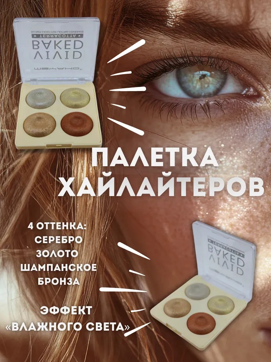 Формула baked (выпеченная) обеспечивает высокую пигментацию при лёгкой текстуре. Такие хайлайтеры создают эффект "подсвеченной кожи" — без жирного блеска и без ощущения плёнки. Они легко растушёвываются, наслаиваются и не подчёркивают текстуру кожи. Средство можно наносить сухим способом для лёгкого свечения или влажным — для более выразительного, зеркального блеска.
