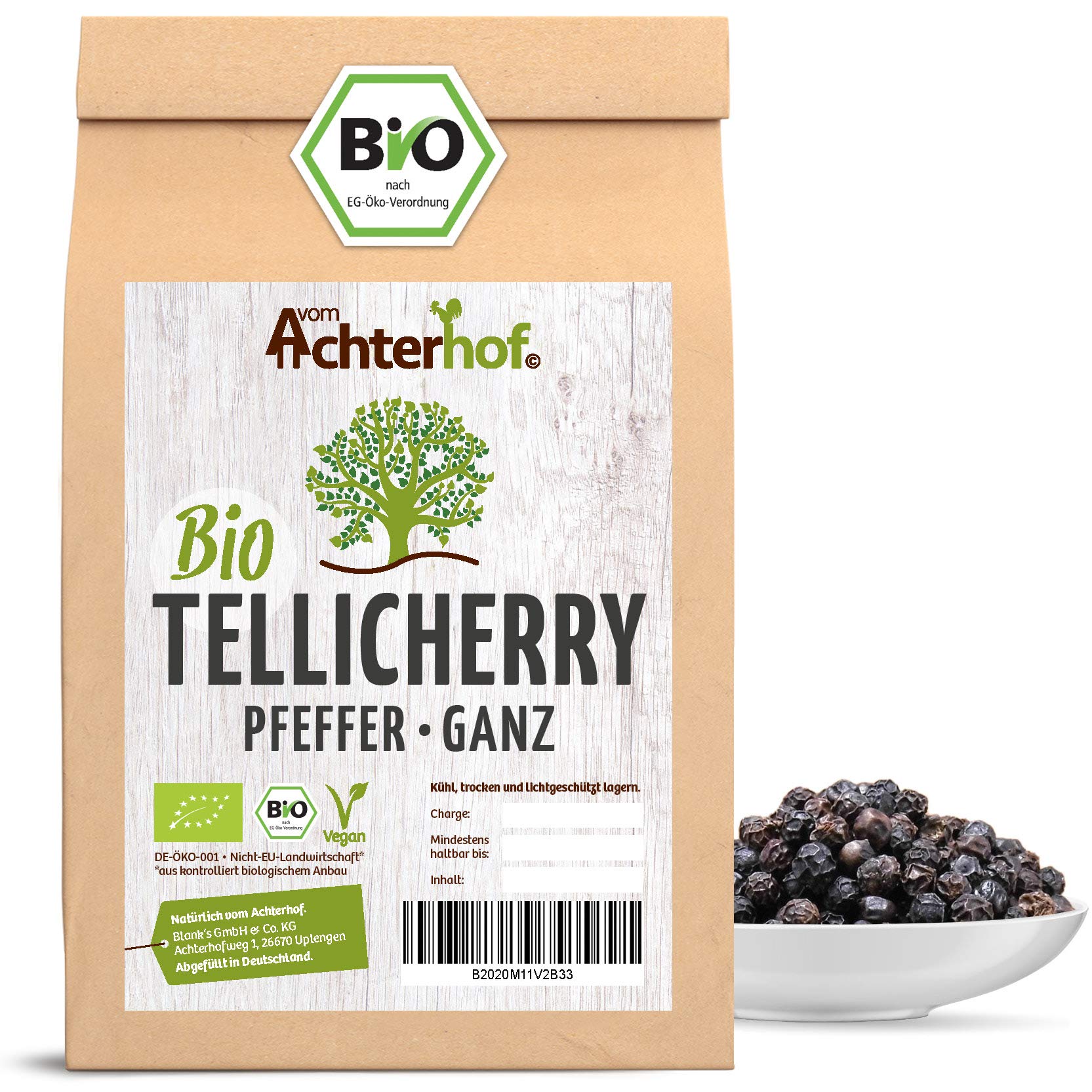 Kontrollstelle: DE-ÖKO-001 aus nicht EU-Landwirtschaft Herkunft: Indien. BIO QUALITÄT – Unsere Pfeffer Koerner sind zu 100 BIO. Jeder Beutel wird per Hand in Deutschland vom-Achterhof abgefüllt und unterliegt ständigen Qualitätskontrollen. AROMA – Als echter Spätlese Pfeffer glänzt er mit einer präzisen Schärfe und einem warmen, vollmundigen Aroma uns somit ein vorzüglicher Steakpfeffer. Sein Duft ist intensiv und mit deutlich nussigen Noten gespickt. Ein idealer Pfeffer für die Pfeffermühle. ERNTE – Diese Spezialität wird nicht unreif geerntet. Die Pfefferbeeren bleiben bis zur völligen Reife am Pfefferstrauch, werden dann per Hand geerntet und getrocknet. Am Ende dieses Prozesses ist der Tellycherry Pfeffer goldbraun und beeindruckend aromatisch. BIO TELLICHERRY PFEFFER KÖRNER - Von der indischen Malabar Küste stammen die exklusiven Pfefferkörner, ein besonders edles Gewürz welches auf der ganzen Welt begehrt ist.
