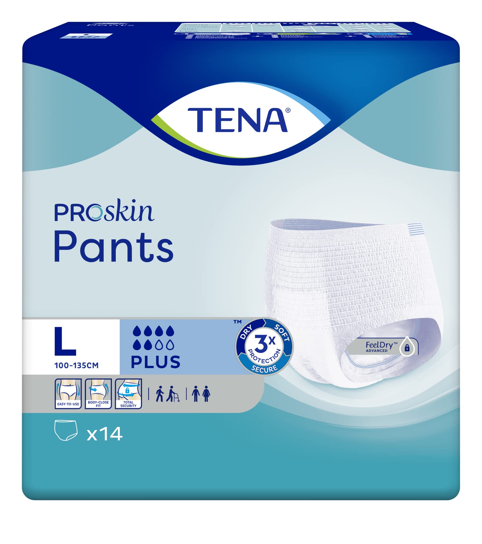 Tena Pants Plus L is absorbent disposable trousers with medium bladder weakness for women and men. The torn side seams and the back tape on the back to close the used product simplify care. Product advantages: - can be put on and pulled out like normal underwear - Very discreet and practical solution that offers security at the same time - The patient's independence results in a lesser effort in care - Tena Pants Plus L ensures a lower consumption- saves time and money - Confiofit - with innovative absorption technology for thin discrete protection - thin, body -friendly fit - for high comfort - Feel Dry - for an absolutely dry feeling - 100 breathable - maximum skin compatibility - Double discharge barriers - offer the highest leakage security - disposable trousers made of fabric -like upper material - guarantees textile wear without ""plastic rustling"" Product applications: - Suction -able disposable trousers with medium bladder weakness - for women and men - Tena Pants Plus L is particularly suitable for demented patients and ""pickers"" Product properties: - Color white green - Size L (87 x 81 cm) - Suction power (ISO) 1440 ml - City 100 - 135 cm (hip circumference)