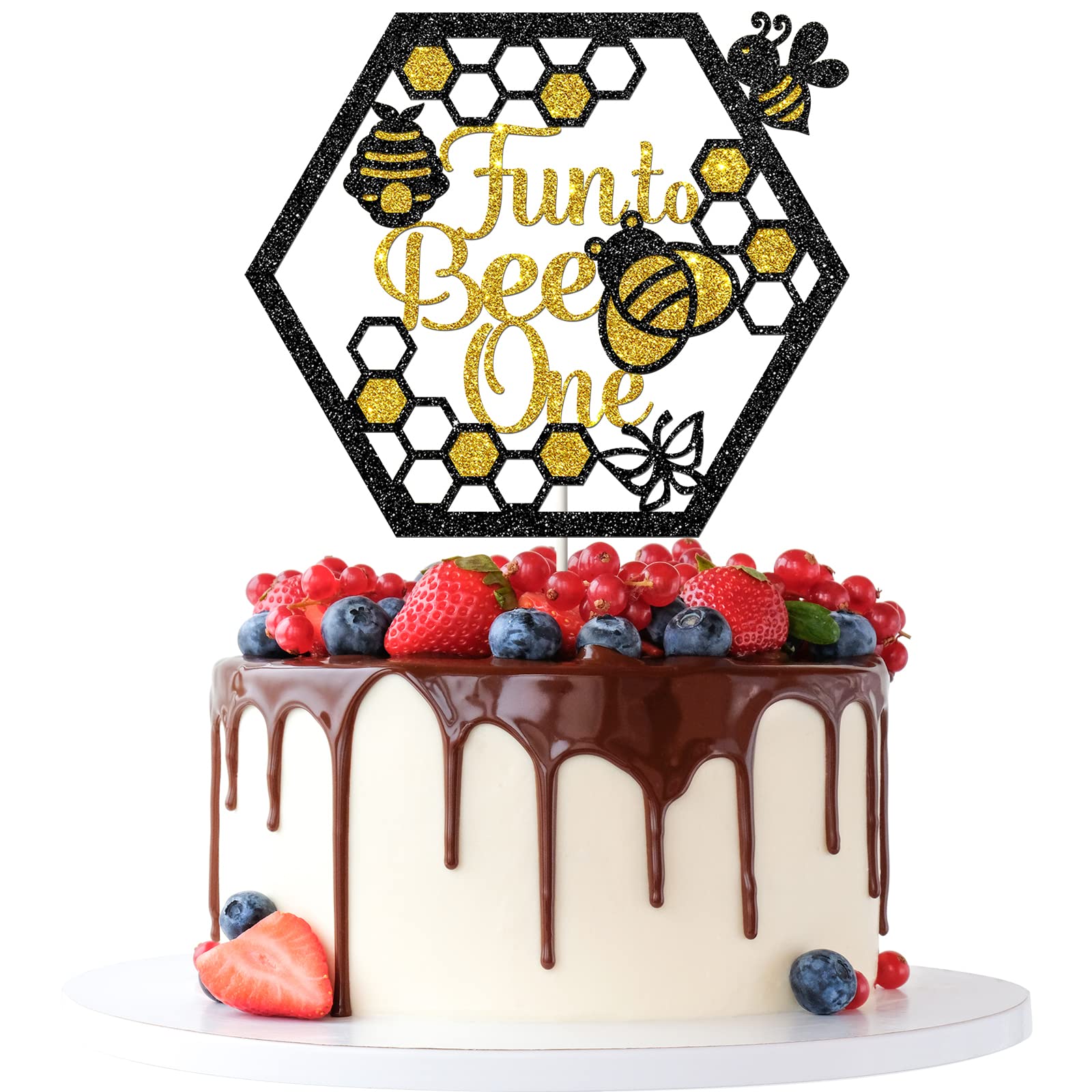 Tenhaisi Fun to Bee One Cake Topper - Bee Theme 1st Birthday Party Decorations - Happy 1st Birthday Party Cake Decor for Boys Girls - Gold&Black Glitter Cake Topper