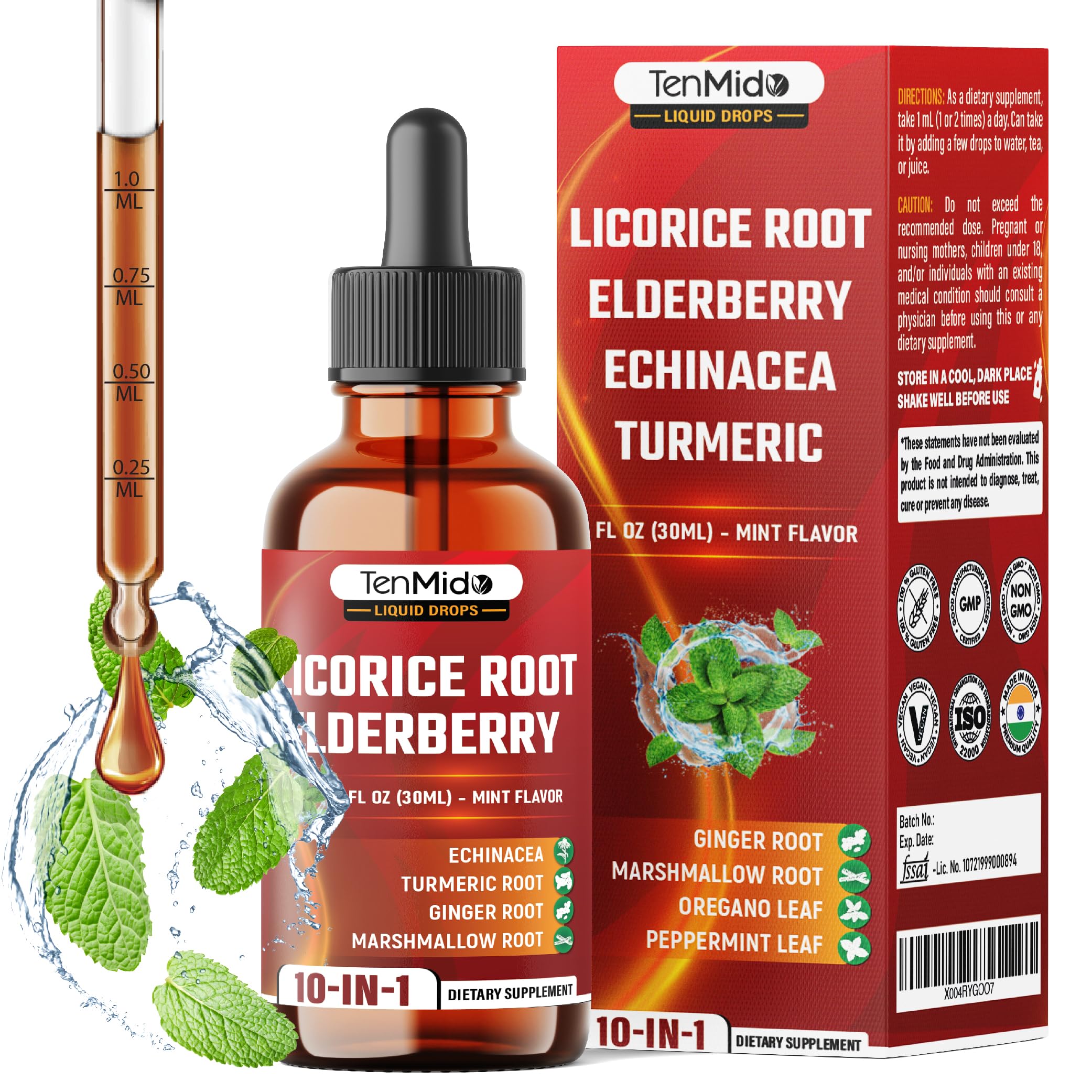 Clean, Safe Premium Quality – Licorice root tincture is produced in a GMP-certified facility, undergo rigorous third-party testing testing to ensure purity and safety, this is alcohol-free, non-GMO, vegan, and gluten-free supplement contains no artificial fillers, preservatives, or unnecessary additives. We always make your health a priority, start your journey towards well-being today!. Fast-Absorbing Liquid – Works Quickly: Liquid Licorice root extract is offered in a convenient format helping better bioavailability and absorption compared to capsules. Alcohol-free, vegan-friendly, and easy on digestion. Take 1ml of Licorice drops daily. Each 30ml bottle provides a full 30-day supply to fit seamlessly into your daily routine. Powerful Blend: Formulated with Licorice plus Elderberry, Ginger, Echinacea, Oregano and Peppermint – this powerful blend is designed to help support immune function and respiratory comfort - an ideal choice for daily supporting. Gut Digestive Wellness Support: Each serving delivers 1000mg of DGL Licorice extract, Turmeric, Ginger, Marshmallow Root, Peppermint, Slippery Elm and Aloe Vera – a synergistic blend of traditionally botanicals used to support healthy digestion and gut harmony. 10-in-1 Herbal Formula: Our Licorice Root Extract Liquid Drops deliver a harmonious combination of 10 potent ingredients like: Deglycyrrhizinated Licorice, Elderberry, Echinacea, Turmeric, Ginger, Marshmallow Root, Oregano, Peppermint, Slippery Elm and Aloe Vera extract in one convenient formula, carefully crafted to help support your daily wellness routine.