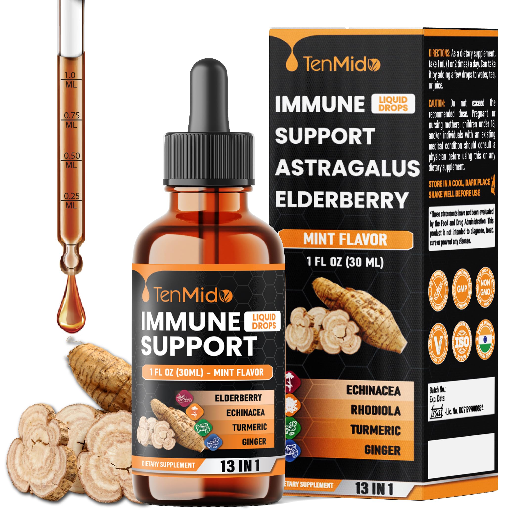 Tenmido 13-in-1 Immune Support Supplement Liquid Drops with Astragalus Elderberry Quercetin Echinacea Chlorophyll Turmeric Ginger Rhodiola Licorice and More - 30ml 1 Fl Oz