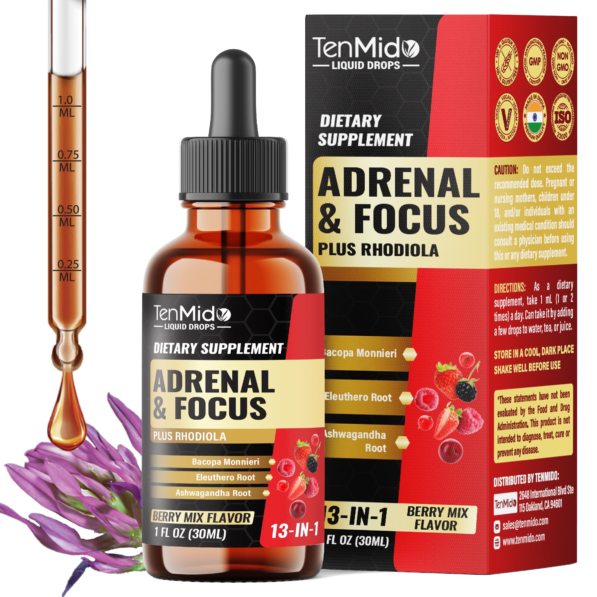 Tenmido 13in1 Adrenal & Focus Support Supplements Liquid Drops with Astragalus Wood Betony Rhodiola Ashwagandha Bacopa Eleuthero Gotu Kola Holy Basil and More - 30 Days Supply - 1FL Oz