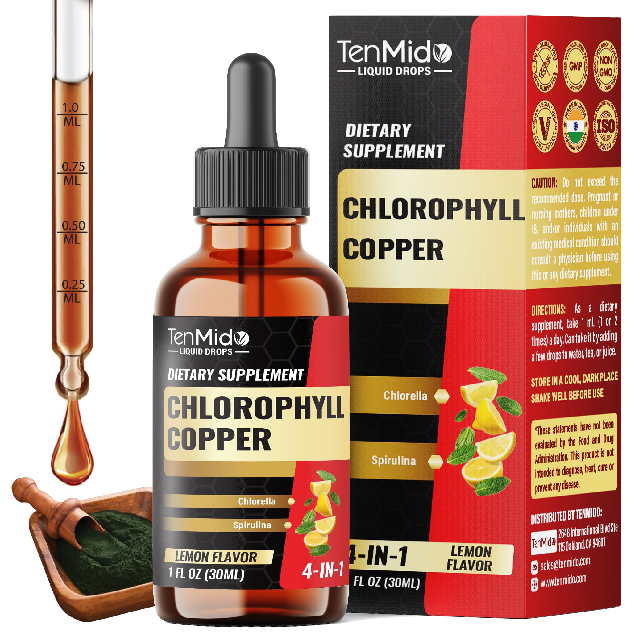 Tenmido 4in1 Chlorophyll Liquid Drops with Copper Chlorella Spirulina - Support Immune System Digestive and Gut Health - Vegan Non-GMO - 30 Days Supply - 1 FL Oz