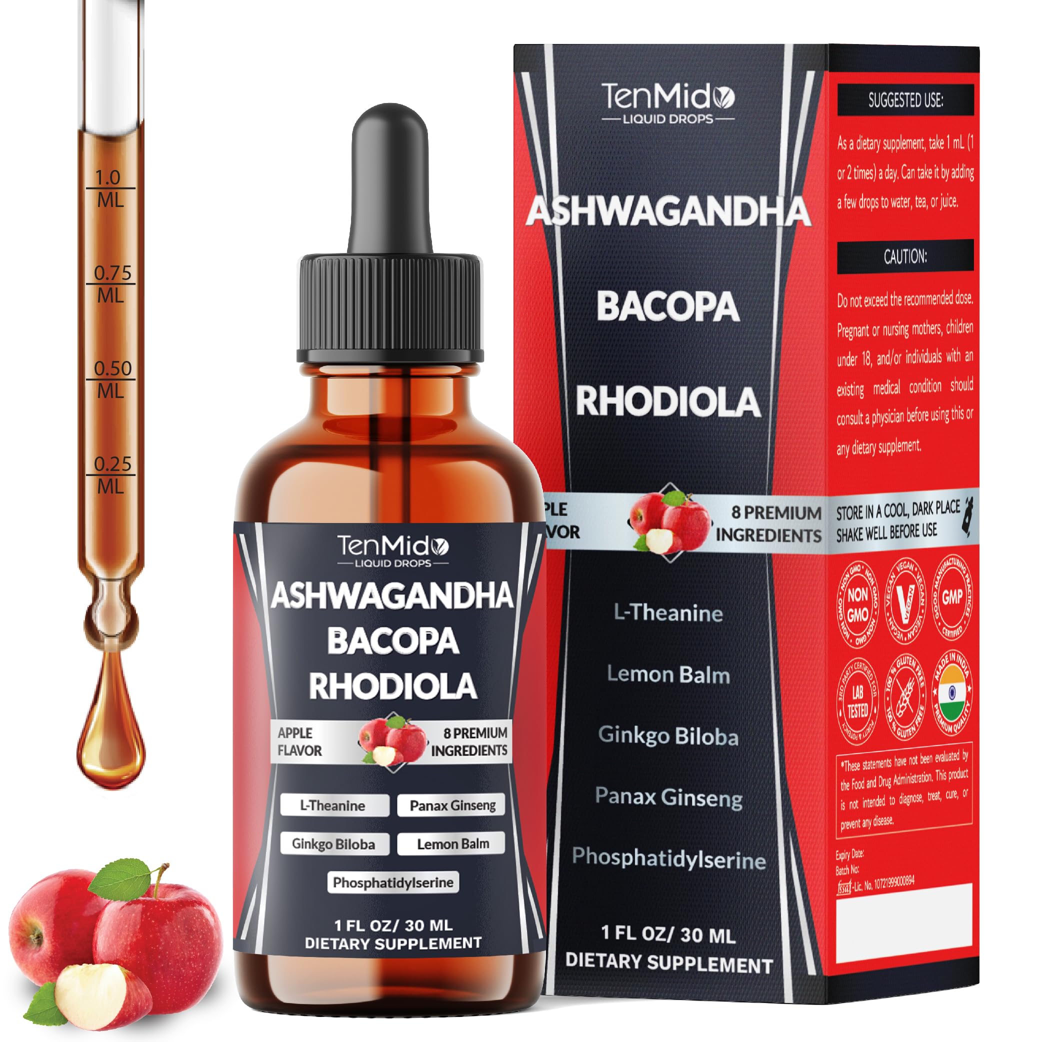 Tenmido 8in1 Ashwagandha Liquid Drops with Bacopa Rhodiola Rosea Phosphatidylserine L-Theanine Panax Ginseng Ginkgo Biloba and Lemon Balm - 30ml 1 Fl Oz