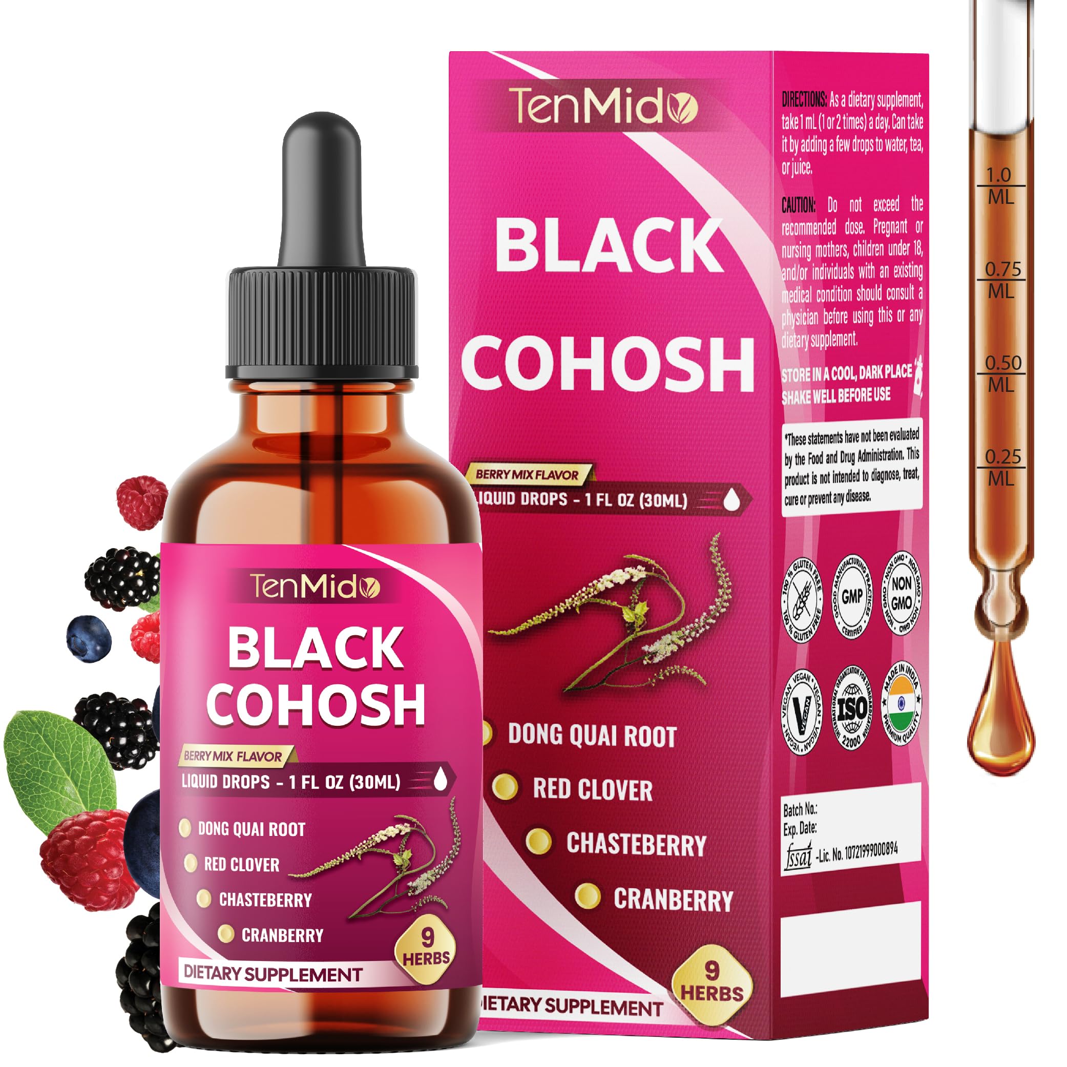 Tenmido 9in1 Liquid Black Cohosh Supplements Women with Dong Quai Red Clover Chasteberry Cranberry Passion Flower Turmeric Rhodiola Rosea and Amla - 30ml Fl Oz