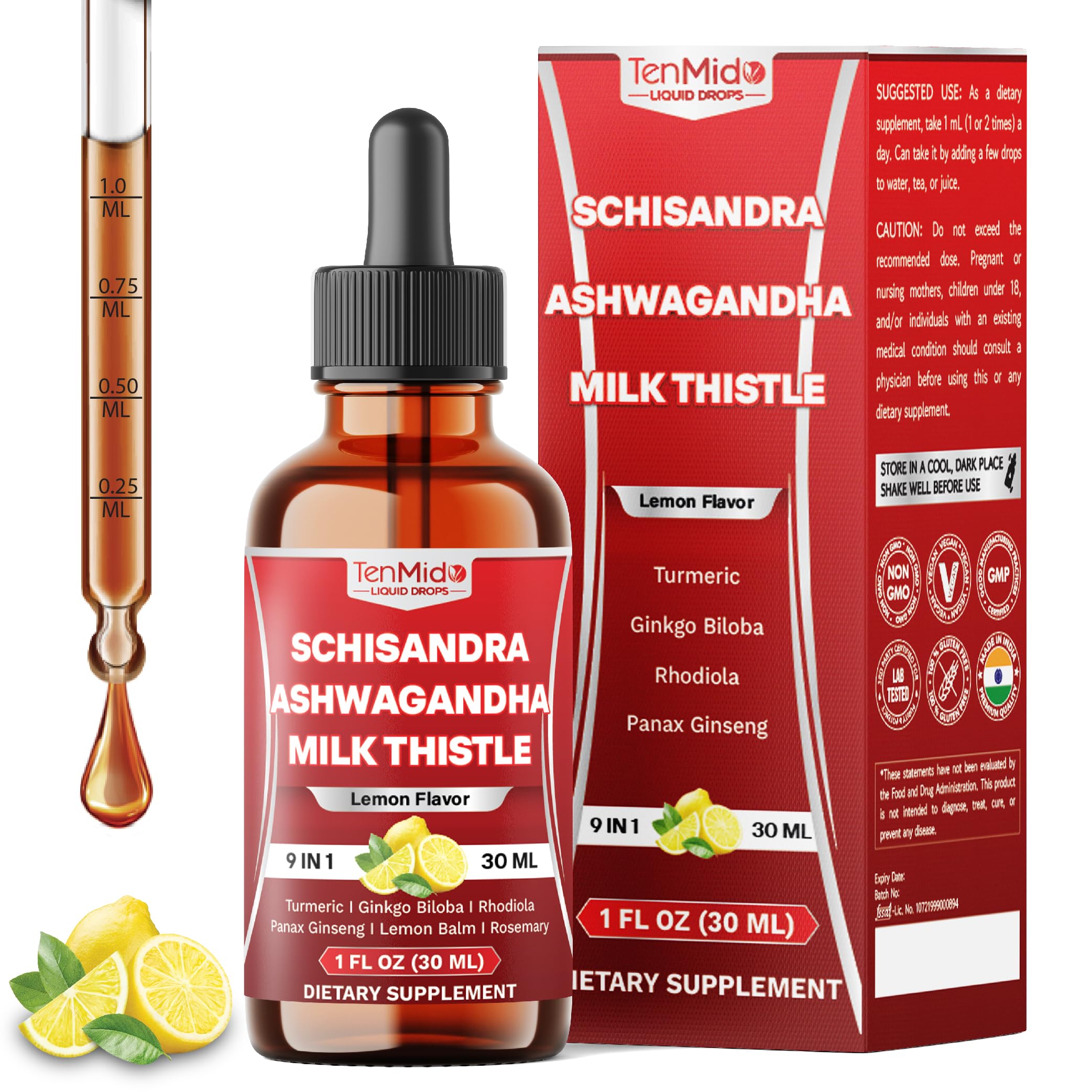 Tenmido 9in1 Schisandra Berry Extract Liquid Drops with Ashwagandha Milk Thistle Turmeric Curcumin Ginkgo Biloba Rhodiola Panax Ginseng Lemon Balm & Rosemary - 30 Days Supply - 1FL Oz