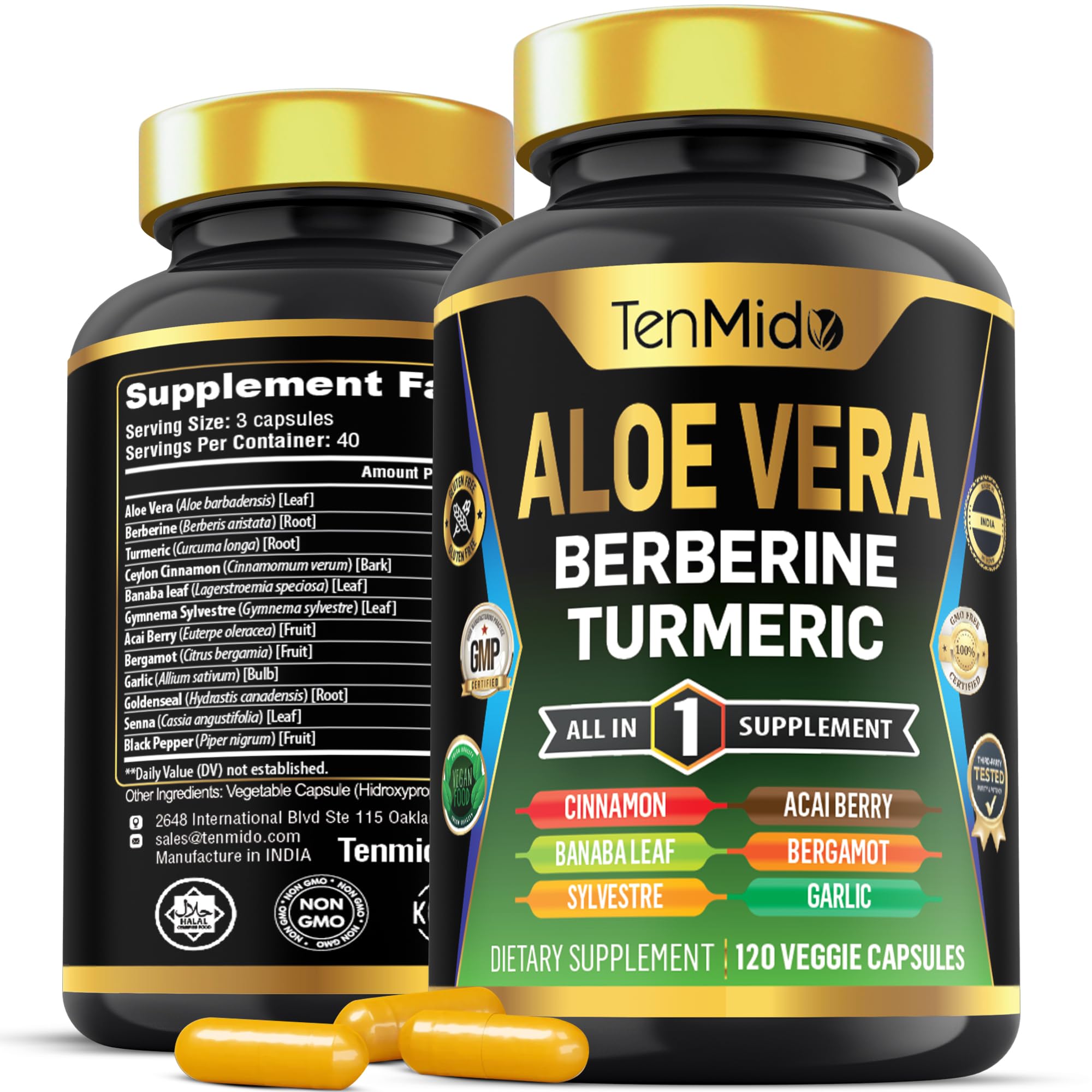 ? At Tenmido, we are dedicated to supporting your health. Our mission is to provide you with an optimized solution and we guarantee product quality because we believe your well-being is paramount. Experience the difference today and discover the power of our herb supplements! If, for any reason, you are unsatisfied with your order, please contact us immediately to get it resolved. You can rest assured that you can use our products, as your satisfaction and health are our top priorities. ? Our supplement undergoes rigorous third-party lab testing to ensure purity. It is manufactured in an FDA-registered facility that follows GMP, Kosher, and Halal standards, guaranteeing non-GMO, gluten-free, and vegetarian-friendly products. We test each batch both ourselves and through a third-party independent laboratory to ensure that your Tenmido product contains the correct standardized level of purity and active ingredients. ? Convenient Nutraceuticals: Tenmido supplement offers an abundance of benefits. Our all-in-one capsules have been packed into one convenient solution that is quick and easy to take. Clear out those clutter of numerous supplements in your cabinet, and make room for a single solution from Tenmido. The Aloe Vera capsules are multi-mineral and provide a great alternative to other single mineral capsules. One bottle contains 120 veggie capsules for 40 days supply. ? Superior Extracts for Enhanced Benefits: Our Aloe Vera supplement is formulated to be more effective than regular Aloe Vera, ensuring maximum absorption and potency. Each serving delivers 1000 mg of Aloe Vera with a 100:1 extract ratio, 100 mg of Berberine extract 30:1, 100 mg of Turmeric extract 20:1, 50 mg of Ceylon Cinnamon extract 20:1, 50 mg of Banaba leaf extract 20:1, 50 mg of Sylvestre extract 20:1, 50 mg of Acai berry extract 20:1 and more, guaranteeing superior quality and potency. ? Advanced Formula: Our Aloe Vera capsules deliver a comprehensive combination of Aloe Vera gel organic, Berberine, Turmeric, Ceylon Cinnamon, Banaba Leaf, Gymnema Sylvestre, Acai berry, Bergamot, Garlic, Goldenseal, Senna, and Black Pepper for Women and Men. Tenmido has developed a potent all-in-one supplement, enriched with 12 potent ingredients. This Aloe Vera concentrate offers a rich blend of nutrients, provides comprehensive reinforcement for human function and overall health.