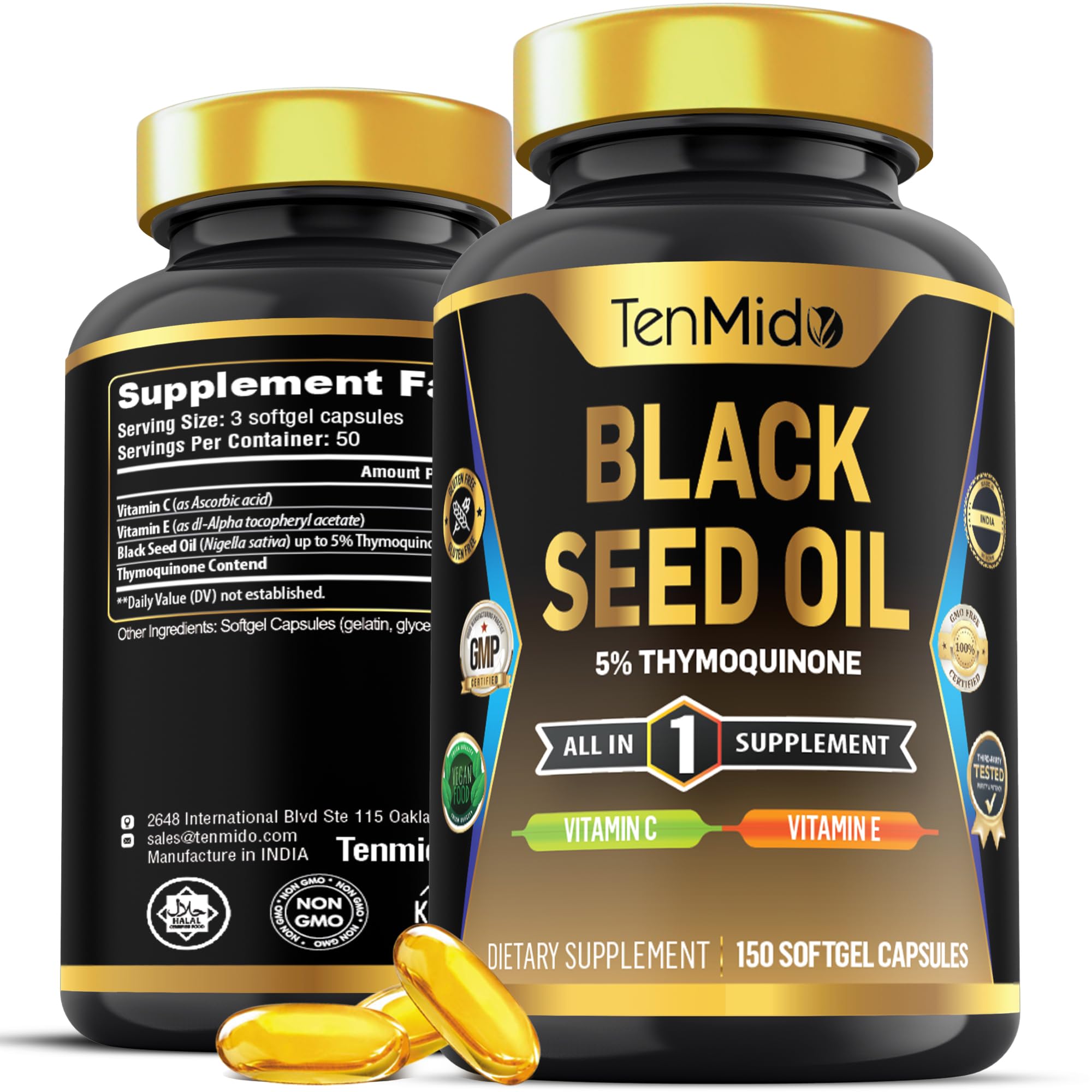 ? Your Health, Our Priority – At Tenmido, we stand by the quality of our organic black seed oil capsules. If you are not completely satisfied, contact us for a full refund. Try it today and experience the benefits of nigella sativa black seed oil today!. ? Certified Purity – Non-GMO Third-Party Tested: Our black seed oil capsules organic cold pressed are manufactured in an FDA-registered, GMP-certified facility and tested for purity. They are non-GMO, gluten-free, and vegetarian-friendly, ensuring the high quality. ? Easy-to-Take Softgel Capsules – No Bitter Taste: Unlike traditional black seed oil liquid, our black seed oil softgels provide all the benefits without the strong taste. Each bottle contains 150 softgels, providing 50-day supply, for effortless daily use. ? Maximum Potency – Cold Pressed for Purity: Our black cumin seed oil capsules contain pure, cold-pressed black seed oil organic to retain essential nutrients. With 80mg Vitamin C 20mg Vitamin E, offers powerful antioxidant and optimal wellness vitality support. ? Advanced Formula with Potent Ingredients: Our organic black seed oil capsules are enriched with 1400mg Black Seed Oil (Nigella Sativa) with 5 Thymoquinone, Vitamin C, and Vitamin E. This black seed oil supplement provides full-body support, helping strengthen immunity, heart health, and digestion.
