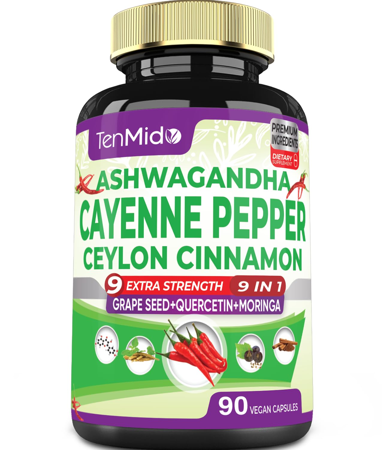 Tenmido Cayenne Pepper Supplements Capsules 3 Months Supply & Ashwagandha Ceylon Cinnamon Grape Seed Quercetin Moringa Ginkgo Biloba - Heart Wellness Promotes Digestive Health -90 Caps