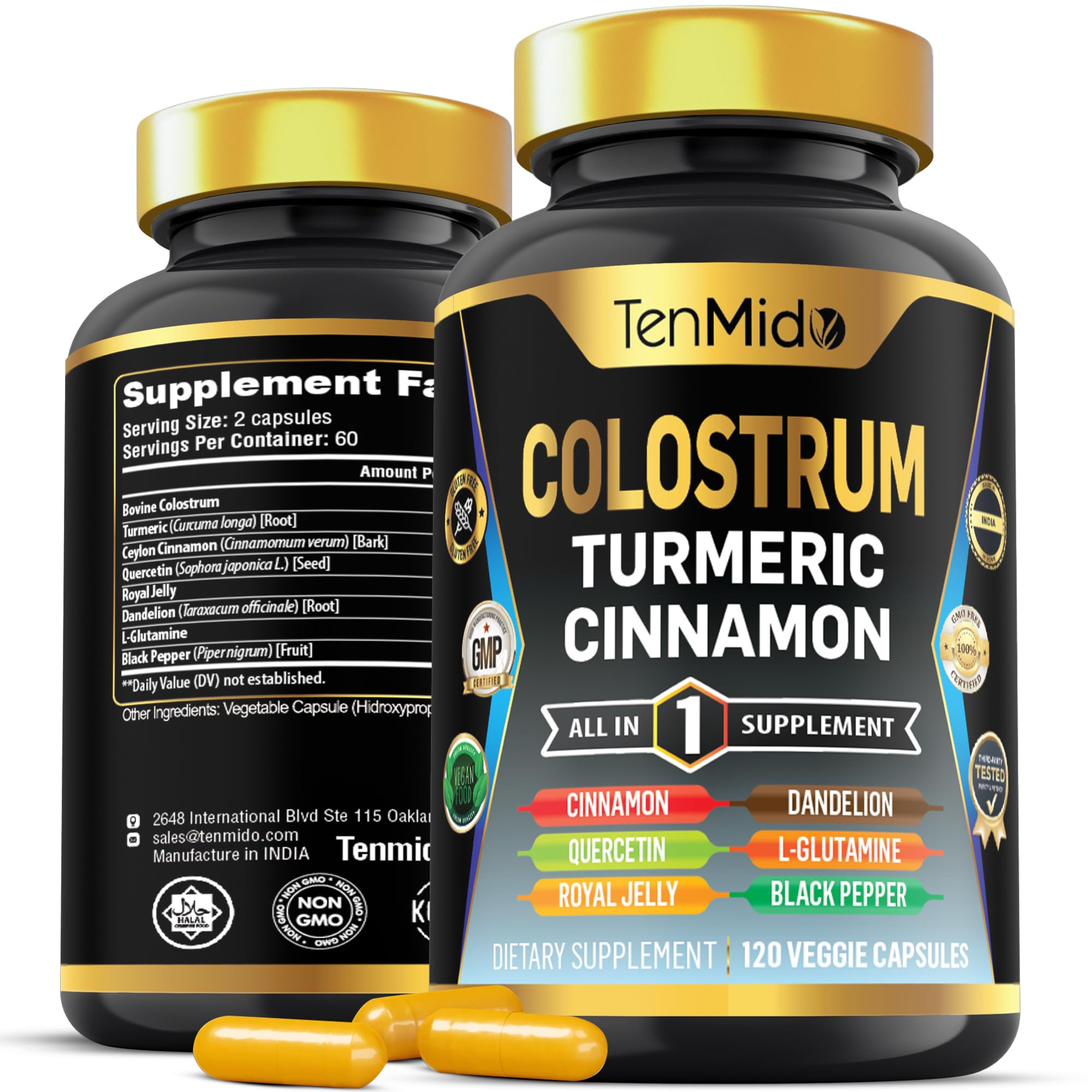 Tenmido Colostrum Supplement - 8in1 Formula - Combine with Turmeric Ceylon Cinnamon Quercetin Royal Jelly Dandelion L- Glutamine and Black Pepper - Digestive Health Support - 120 Capsules