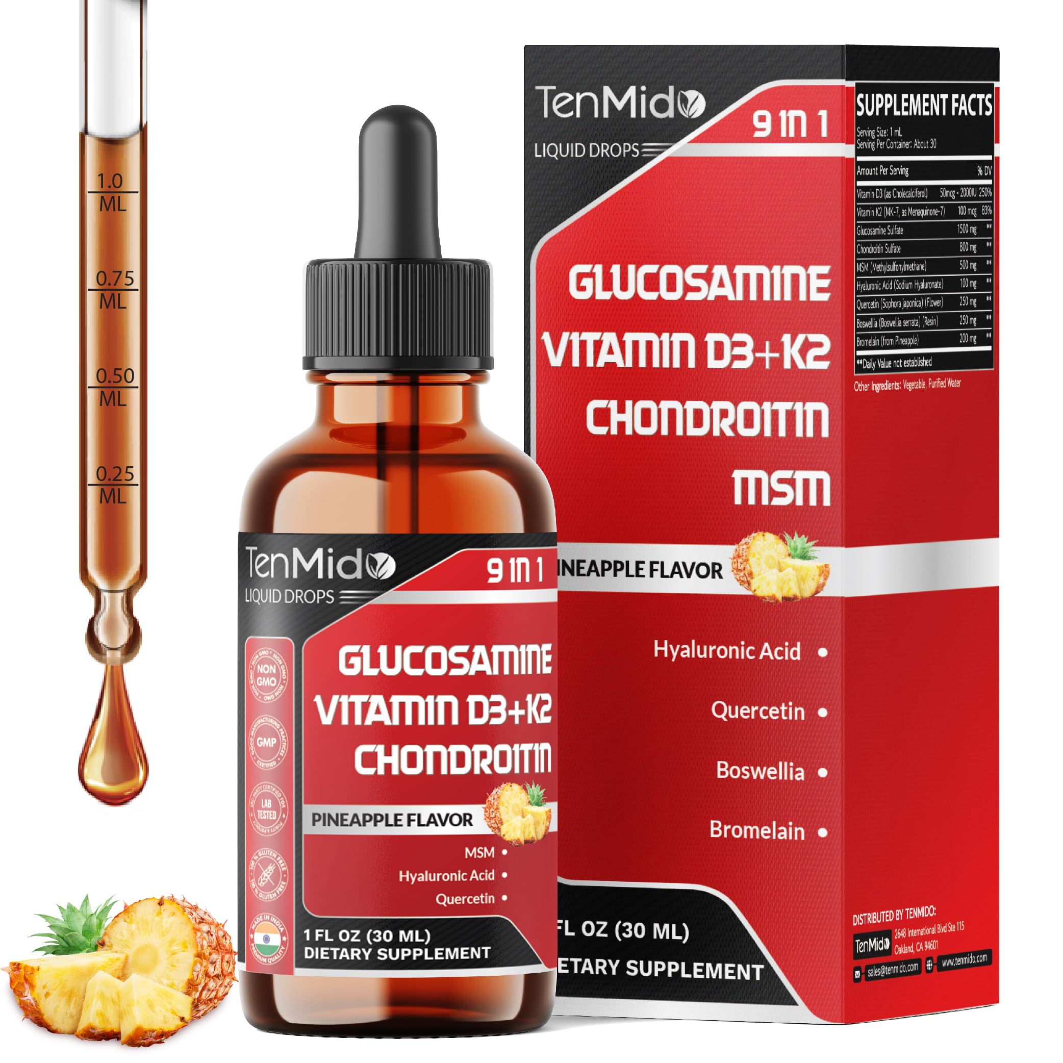 Tenmido Glucosamine Chondroitin MSM Liquid Drops - 9in1 with Vitamin D3 Vitamin K2 Hyaluronic Acid Quercetin Boswellia and Bromelain - Vegan Non-GMO - 30ml 1 Fl Oz
