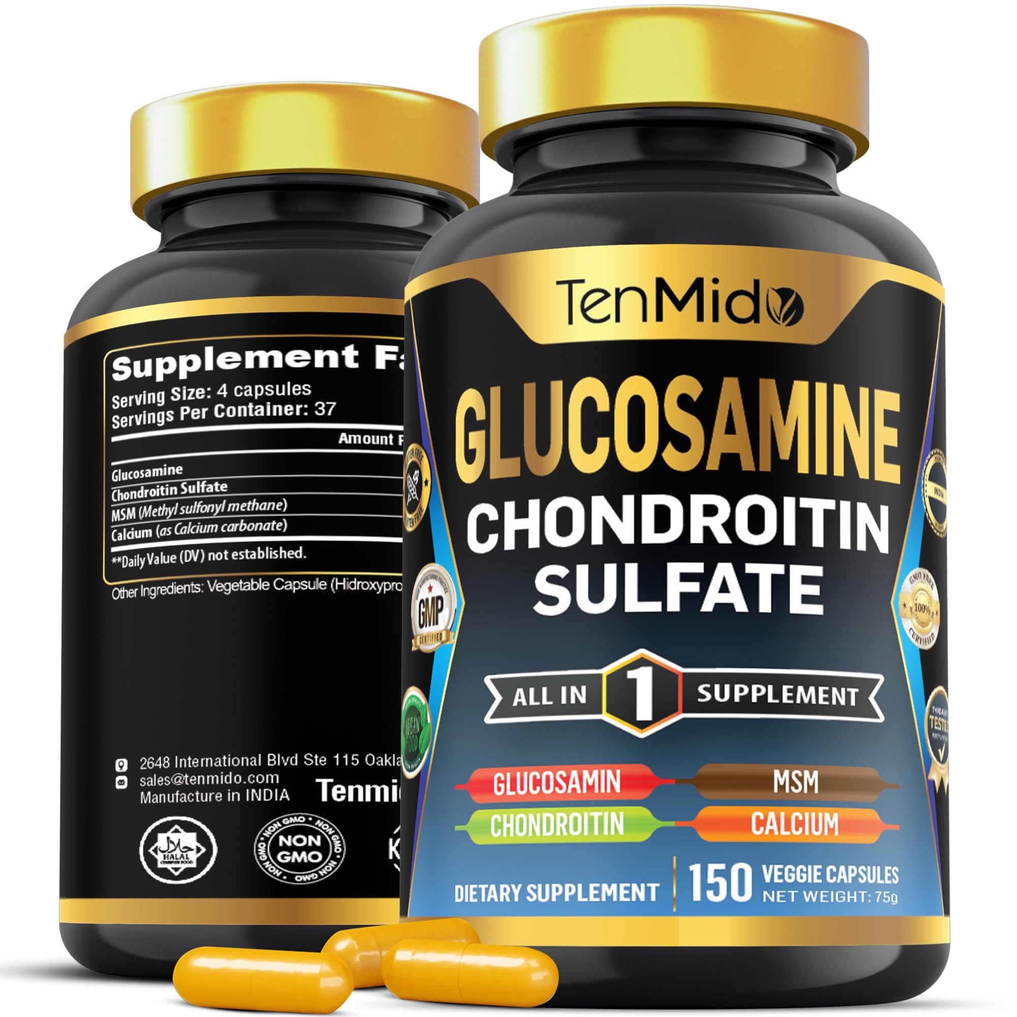 ? At Tenmido, we are dedicated to supporting your health. Our mission is to provide you with an optimized solution and we guarantee product quality because we believe your well-being is paramount. Experience the difference today and discover the power of our herb supplements! If, for any reason, you are unsatisfied with your order, please contact us immediately to get it resolved. You can rest assured that you can use our products, as your satisfaction and health are our top priorities. ? Our supplement undergoes rigorous third-party lab testing to ensure purity. It is manufactured in an FDA-registered facility that follows GMP, Kosher, and Halal standards, guaranteeing non-GMO, gluten-free, and vegetarian-friendly products. We test each batch both ourselves and through a third-party independent laboratory to ensure that your Tenmido product contains the correct standardized level of purity and active ingredients. ? Convenient Solution: Tenmido supplement offers an abundance of benefits. Our all-in-one capsules have been packed into one convenient solution that is quick and easy to take. Clear out those clutter of numerous supplements in your cabinet, and make room for a single solution from Tenmido. The Glucosamine supplements are multimineral and provide a great alternative to other single mineral capsules. One bottle contains 150 veggie capsules for 37 days supply. ? Superior Ingredients for Enhanced Benefits: Our Glucosamine is formulated to be more effective than regular Glucosamine, ensuring maximum absorption and potency. Each serving delivers 1600 mg of Glucosamine, 250 mg of Chondroitin Sulfate, 100 mg of MSM, 50 mg of Calcium, and more guaranteeing superior quality and potency. Our supplement is an ideal choice for your health. ? Advanced Formula with a comprehensive combination of Glucosamine, Chondroitin Sulfate, MSM, Calcium for Women and Men. Tenmido has developed a potent all-in-one supplement, enriched with 4 potent ingredients. This concentrated Glucosamine supplement presents a rich blend of nutrients, promotes optimal joint mobility, energy, and comprehensive reinforcement for human function.