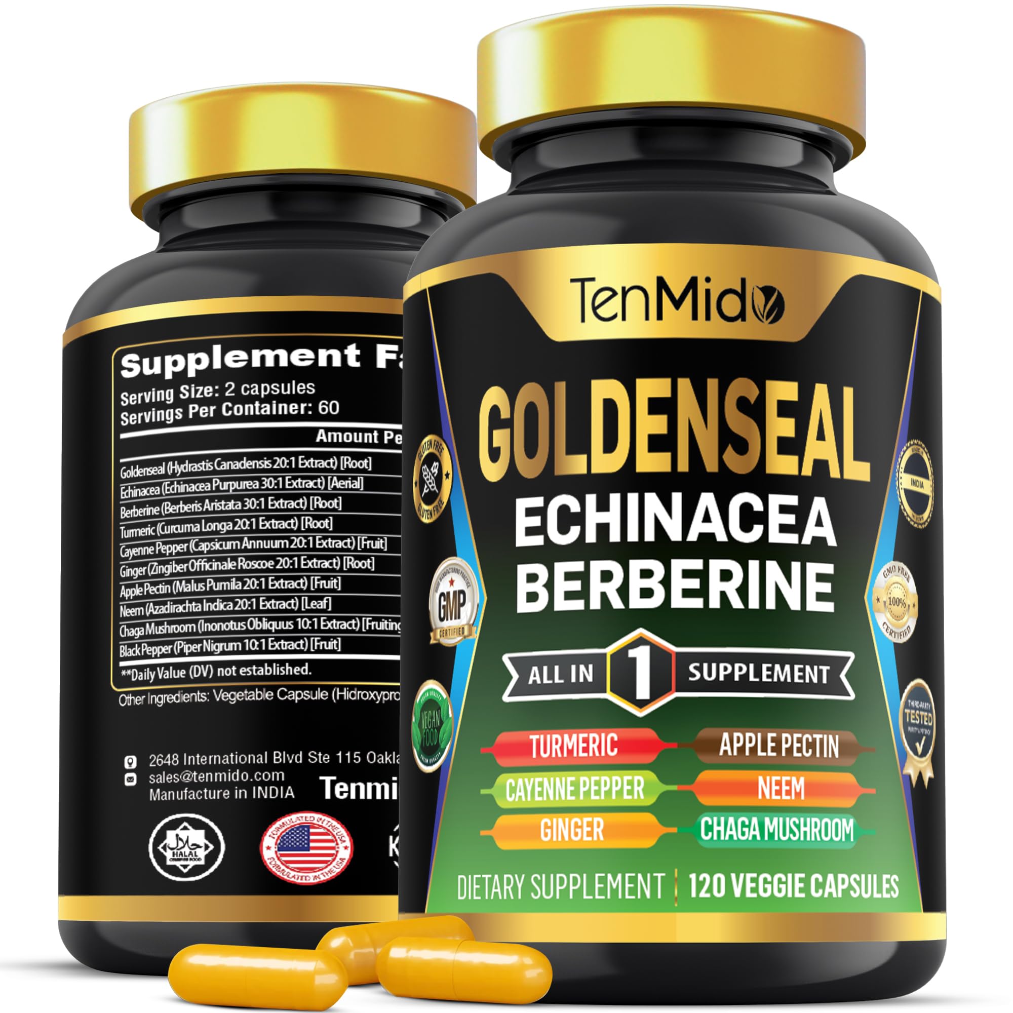 ? At Tenmido, we are dedicated to supporting your health. Our mission is to provide you with an optimized solution and we guarantee product quality because we believe your well-being is paramount. Experience the difference today and discover the power of our herb supplements! If, for any reason, you are unsatisfied with your order, please contact us immediately to get it resolved. You can rest assured that you can use our products, as your satisfaction and health are our top priorities. ? Our Goldenseal capsule undergoes rigorous third-party lab testing to ensure purity. It is manufactured in an FDA-registered facility that follows GMP, Kosher, and Halal standards, guaranteeing non-GMO, gluten-free, and vegetarian-friendly products. We test each batch both ourselves and through a third-party independent laboratory to ensure that your Tenmido product contains the correct standardized level of purity and active ingredients. ? Convenient Nutraceuticals: Tenmido supplement offers an abundance of benefits. Our all-in-one capsules have been packed into one convenient solution that is quick and easy to take. Clear out those clutter of numerous supplements in your cabinet, and make room for a single solution from Tenmido. The Goldenseal capsules are multi-mineral and provide a great alternative to other single mineral capsules. One bottle contains 120 veggie capsules for 2 months supply. ? Superior Extracts for Enhanced Benefits: Our Golden Seal capsule is formulated to be more effective than regular Goldenseal, ensuring maximum absorption and potency. Each serving delivers 600 mg of Goldenseal herb with a 20:1 extract ratio, 100 mg of Echinacea extract 30:1, 100 mg of Berberine extract 30:1, 50 mg of Turmeric extract 20:1, 50 mg of Cayenne Pepper extract 20:1, 30 mg of Ginger extract 20:1, 30 mg of Apple Pectin extract 20:1, and more, guaranteeing superior quality and potency. ? Advanced Formula with a comprehensive combination of Goldenseal root, Echinacea, Berberine, Turmeric, Cayenne Pepper, Ginger, Apple Pectin, Neem, Chaga Mushroom and Black Pepper for Women and Men. Tenmido has developed a potent all-in-one supplement, enriched with 10 potent ingredients. This concentrated Goldenseal supplement presents a rich blend of nutrients, provides comprehensive reinforcement for human function and overall health.