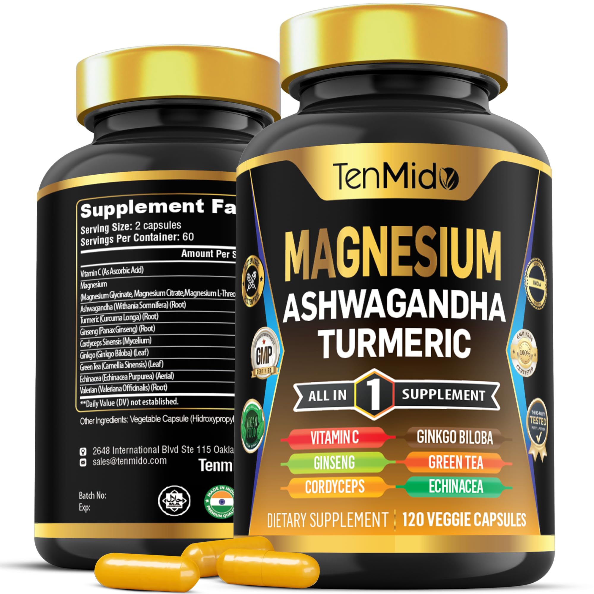 ? At Tenmido, we are dedicated to supporting your health. Our mission is to provide you with an optimized solution and we guarantee product quality because we believe your well-being is paramount. Experience the difference today and discover the power of our herb supplements! If, for any reason, you are unsatisfied with your order, please contact us immediately to get it resolved. You can rest assured that you can use our products, as your satisfaction and health are our top priorities. ? Our supplement undergoes rigorous third-party lab testing to ensure. It is manufactured in an FDA-registered facility that follows GMP, Kosher, and Halal standards, guaranteeing non-GMO, gluten-free, and vegetarian-friendly products. We test each batch both ourselves and through a third-party independent laboratory to ensure that your Tenmido product contains the correct standardized level and active ingredients. ? Tenmido supplement offers an abundance of benefits. Our all-in-one capsules have been packed into one convenient solution that is quick and easy to take. Clear out those clutter of numerous supplements in your cabinet, and make room for a single solution from Tenmido. The Magnesium supplement are multimineral and provide a great alternative to other single mineral capsules. One bottle contains 120 veggie capsules for 2 months supply. ? Our Magnesium supplement is formulated to be more effective than regular Magnesium, ensuring maximum absorption. Each serving delivers Magnesium powder, Ashwagandha, Turmeric, Panax Ginseng, Cordyceps, Ginkgo Biloba extract and more guaranteeing superior quality. ? Advanced Formula with a comprehensive combination of 3 types of Magnesium with Ashwagandha, Turmeric, Panax Ginseng, Cordyceps, Ginkgo Biloba, Vitamin C, Green Tea, Echinacea and Valerian. Tenmido has developed a all-in-one supplement. As a supplement, Magnesium Complex presents a rich blend of nutrients, provides comprehensive reinforcement for human function and overall health.